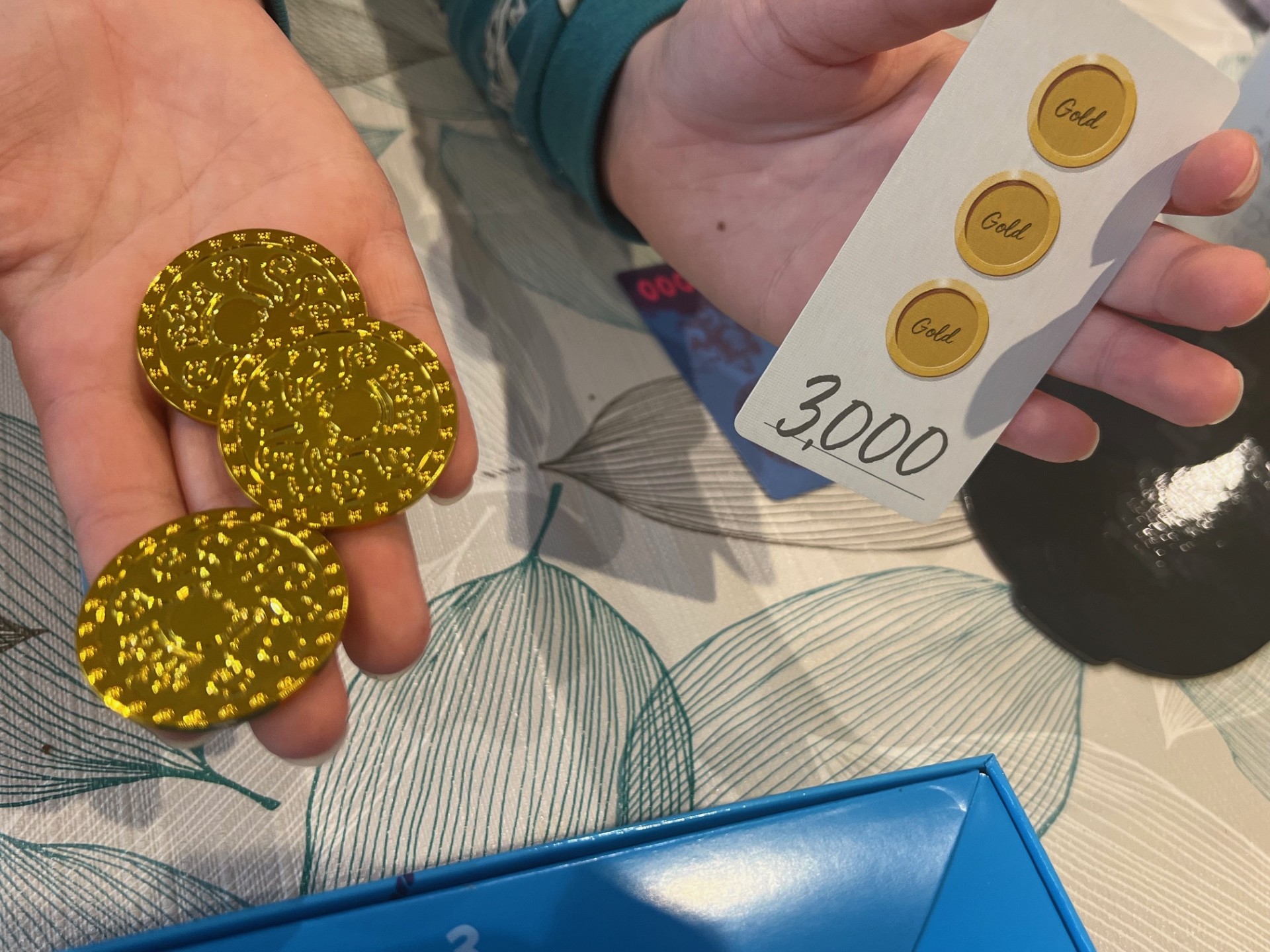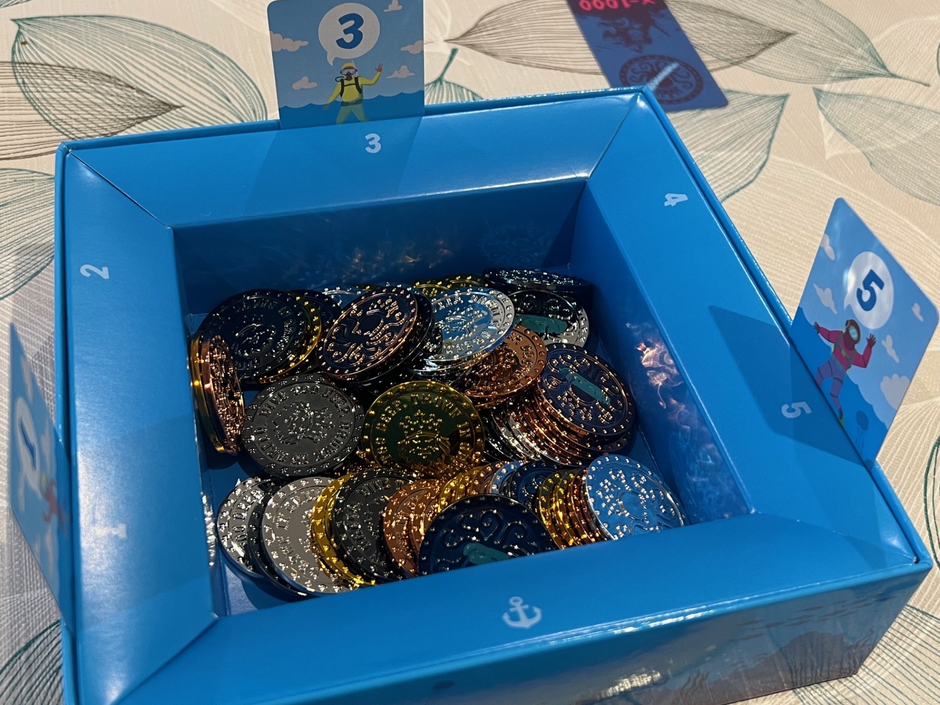 Mechanically, Diver Go! blends memory recall with set collection — you’re not just grabbing any coin, but planning which ones will give you the best return. The curse mechanic complicates this in a fun way, as coins you thought were safe may show a curse symbol on their reverse side that unravels your entire plan and causes great eruptions of excitement around the table.