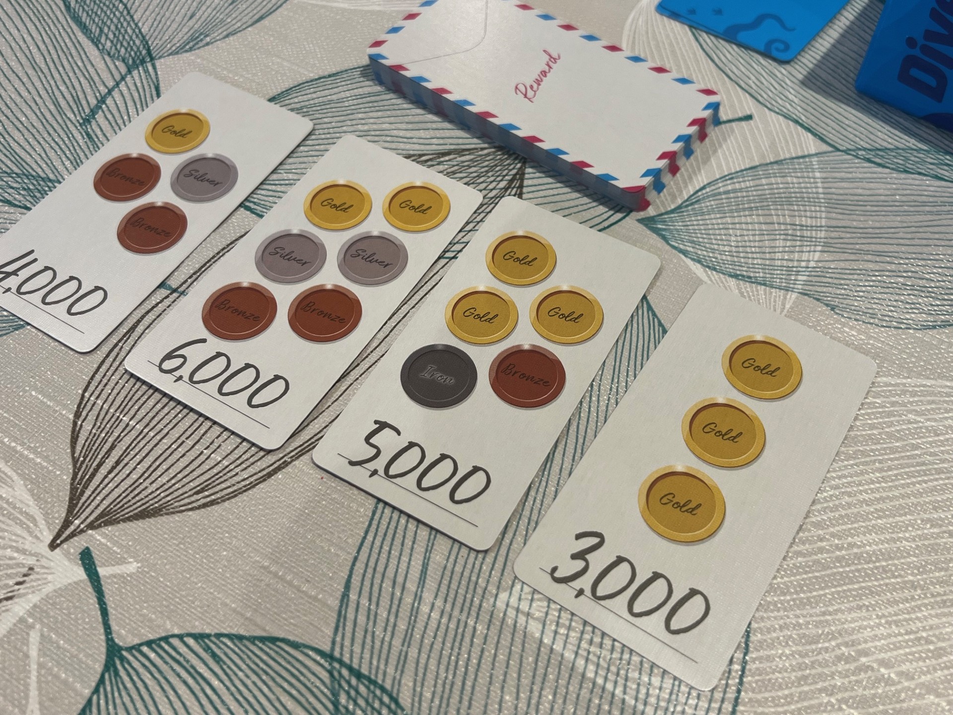 At its core, Diver Go! is about scanning, remembering, and retrieving treasure. At the start of each round, players are given a brief moment to study a glittering seabed of coins piled inside the box. These coins represent treasures of four materials including gold, silver, bronze and iron, but the twist here is that about half of them are cursed with a blue symbol.