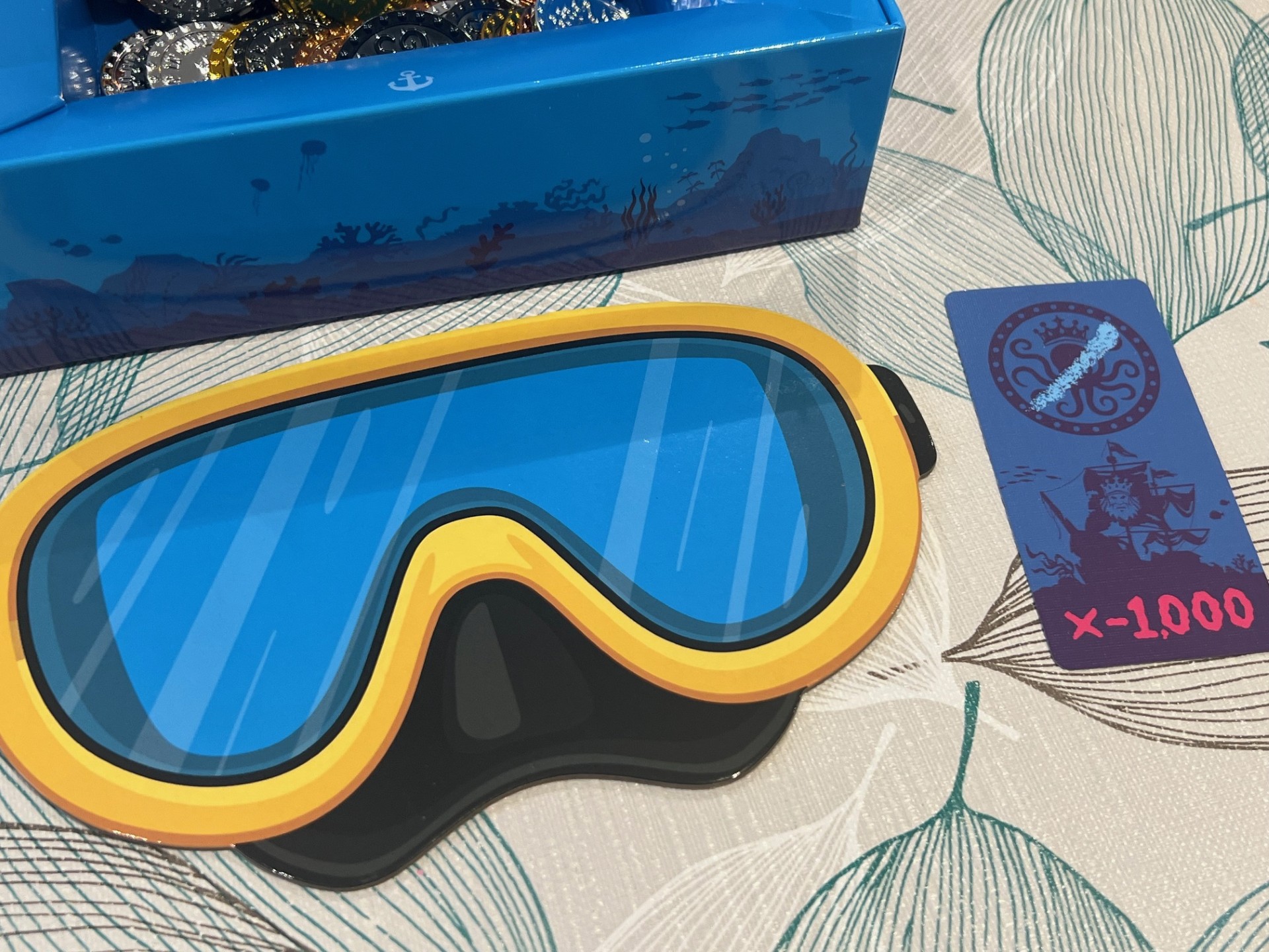 Once the dive begins, players cover their eyes with a thick, cardboard diving mask and must attempt to collect coins they recall spotting. Curses are only printed on one side of any affected coin, so whilst you may recall the position of a few on the surface, there’s an aspect of luck both because of hidden curses and because the coins move as you touch them.
