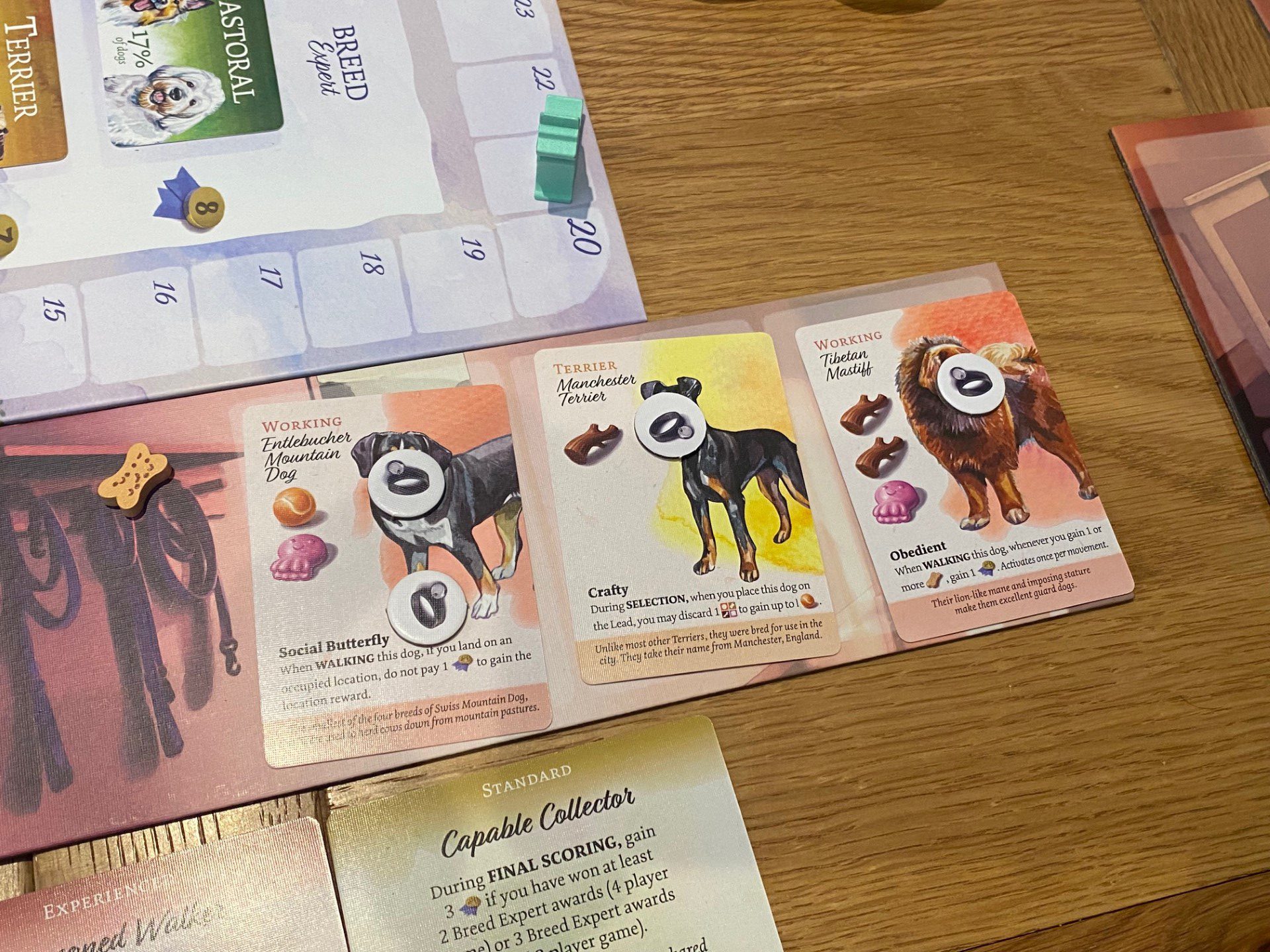 At the end of the game, players will use a scorepad to calculate their overall score — adding together their reputation points, the points earned for breed expert cards (based on who has most of each type), any points earned from dog abilities, any objectives (if achieved) and then finally one point for every five resources you have left over.