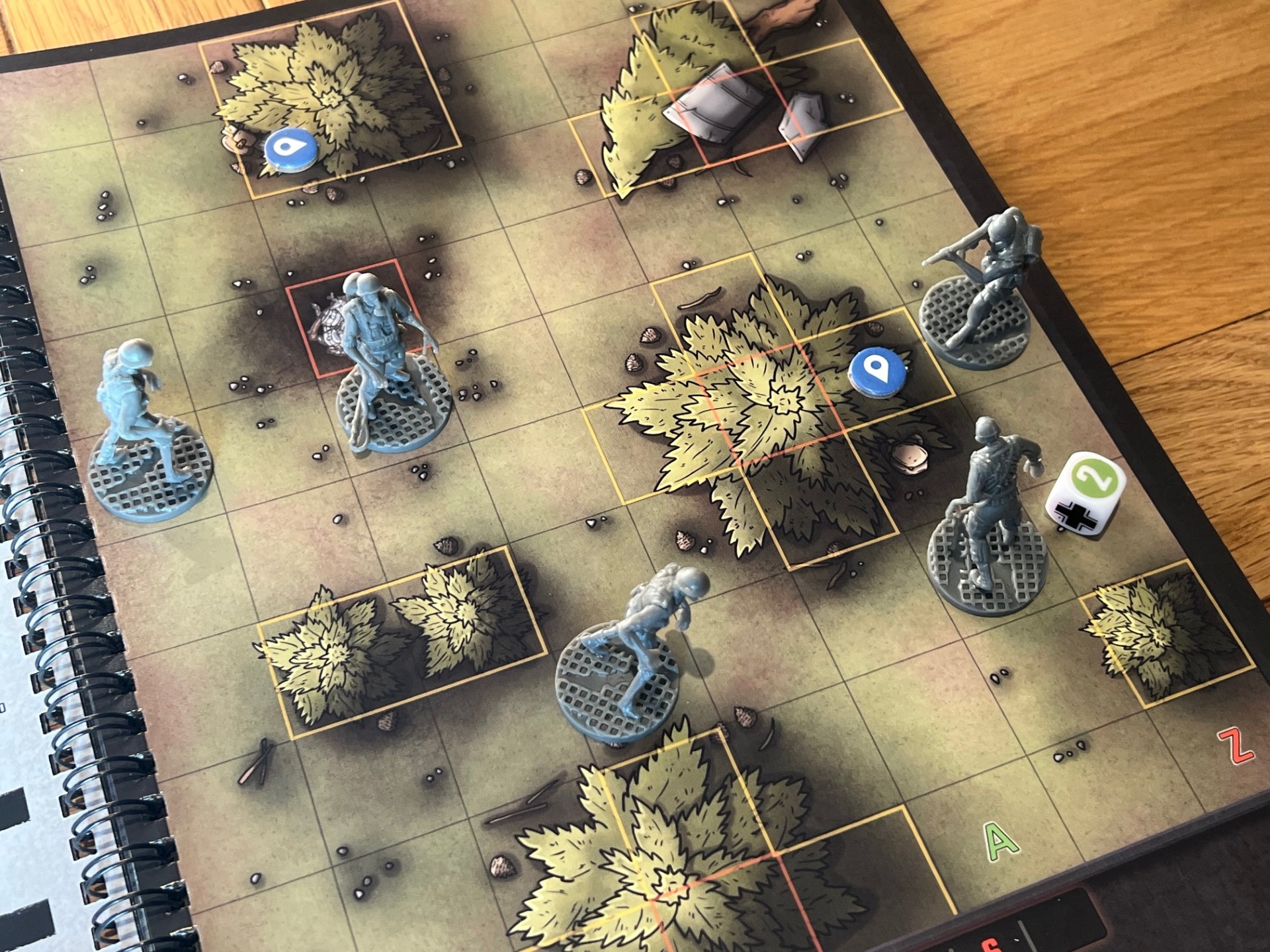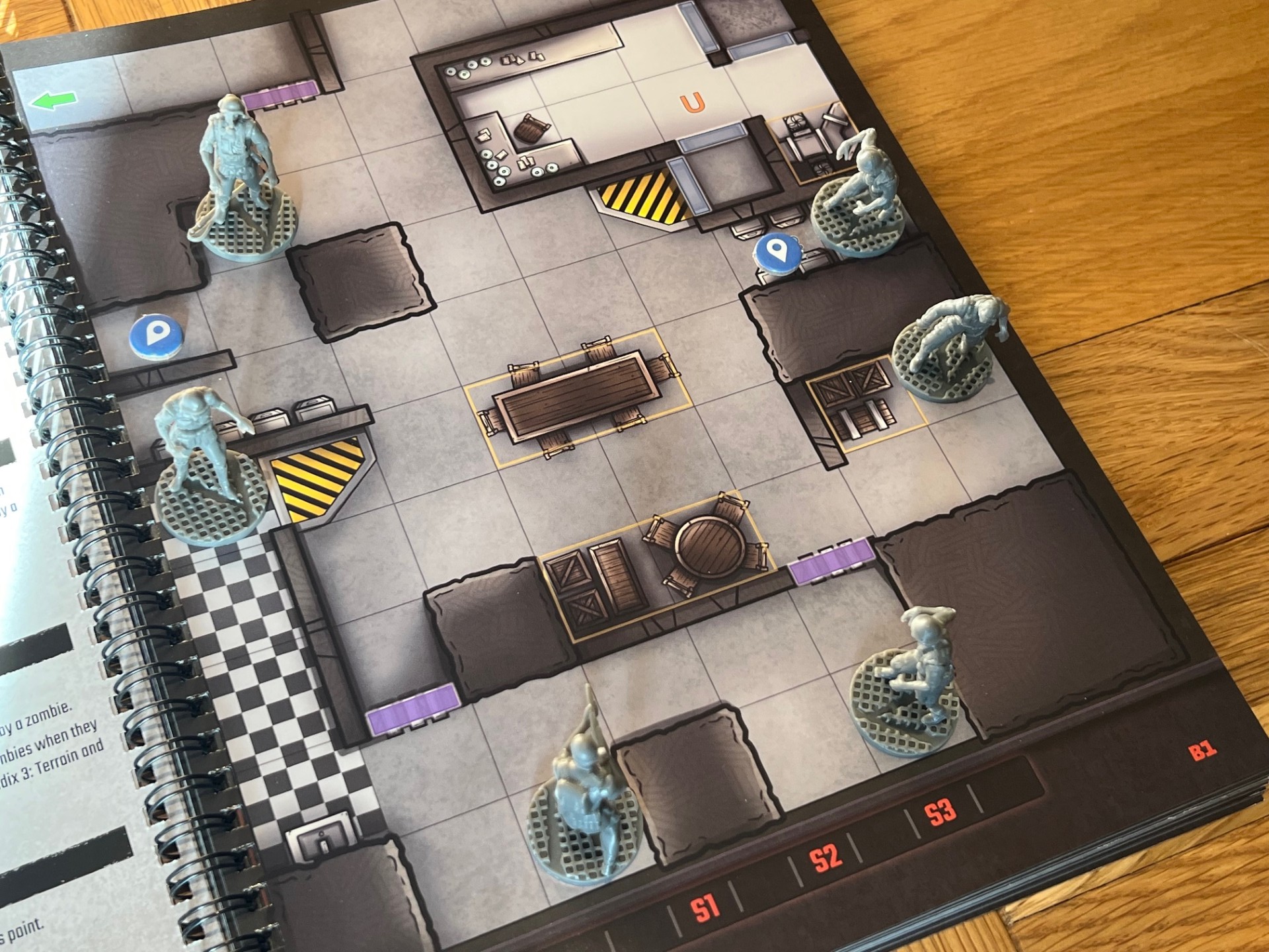 Gameplay unfolds across a series of linked scenarios, each played on maps presented as part of a ring-bound book that includes scenario specific rules, an illustrated map and any narrative. These maps are richly detailed — claustrophobic corridors, decaying laboratories, and occult chambers onto which you add cardboard doors and in this Deluxe Edition, plastic zombie and survivor models. The maps and miniatures serve well as both tactical terrain and narrative backdrop, with each scenario introducing new objectives, enemies, and environmental hazards, creating a sense of escalation and discovery.