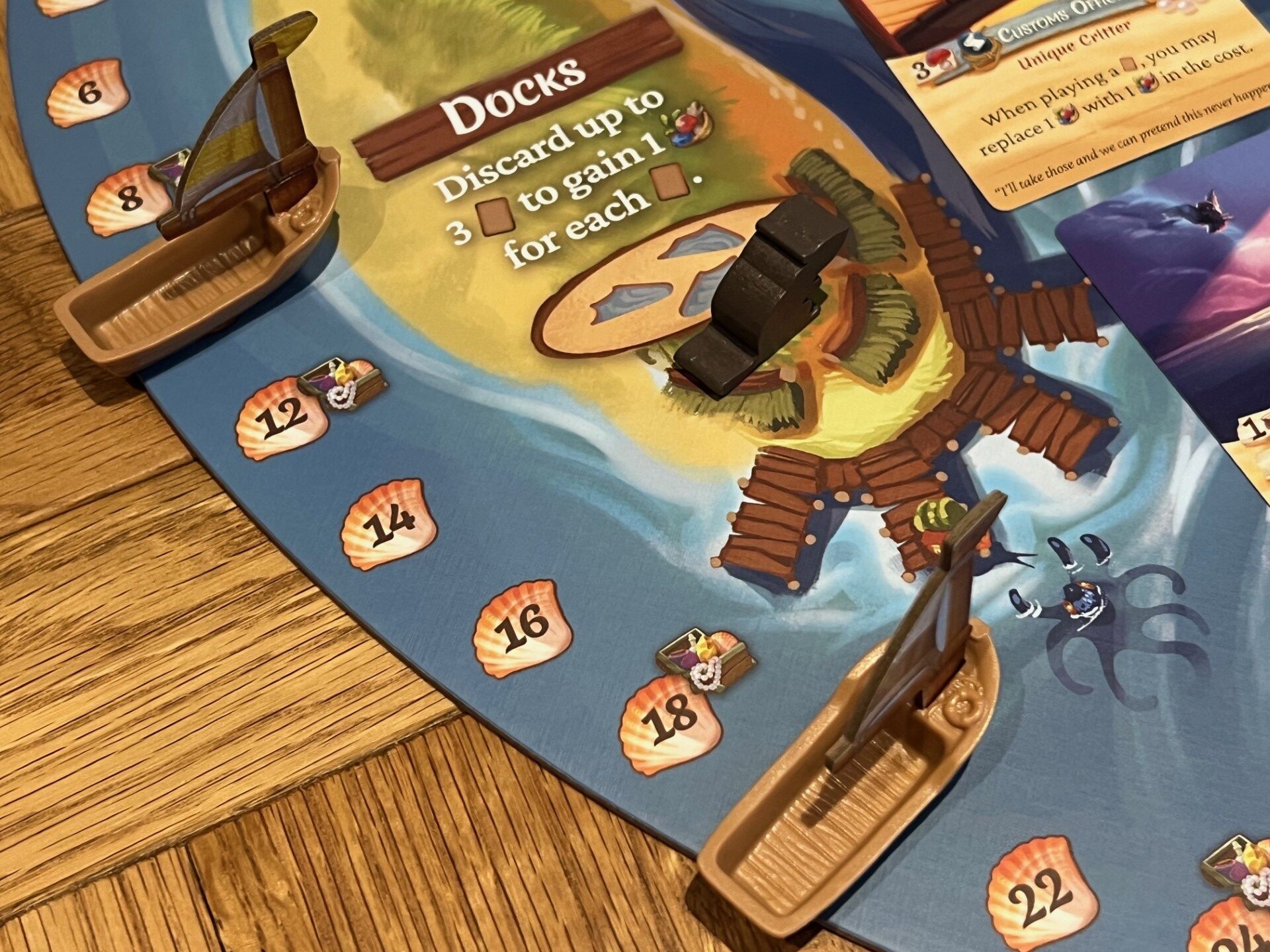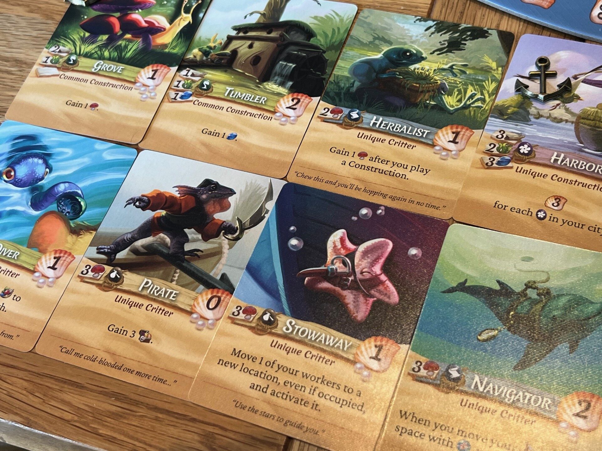 The cards are also of superb quality, both in terms of the material used and the printing finish, but also with respect to the artwork on them. Everdell was well known for its setting — with cute, expressive animals pictured against homely shelters and buildings that invoked Beatrix Potter and many other literary sources that feel familiar and welcome. Farshore is no different, with the shift from woodland (or dell, as it were) to seaside being completely seamless, and the new animals and locations feeling completely attached to the Everdell world.