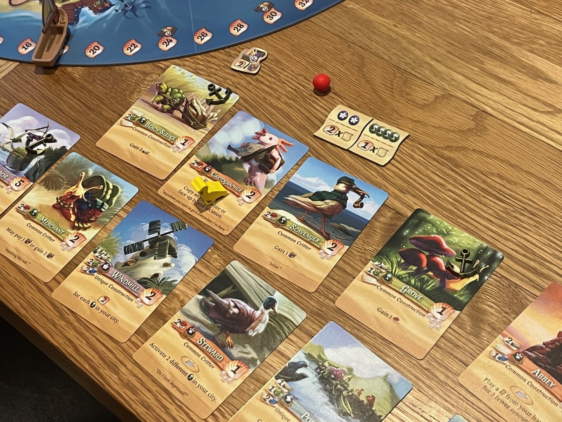 Finally, I mentioned earlier that the occupation mechanic from Everdell had been adjusted in Farshore. Now, instead of having to match two very specific cards in a deck of hundreds, players receive three metal anchor tokens. As a turn, a player may use one of these tokens to place on a construction card they have already built, and then they can immediately play a critter with the same symbol for free. At first I assumed I’d got this wrong as it seems too powerful – but it really is as simple as that, and can regularly save you three or more mushrooms, plus the turn(s) it would have taken to gather them.