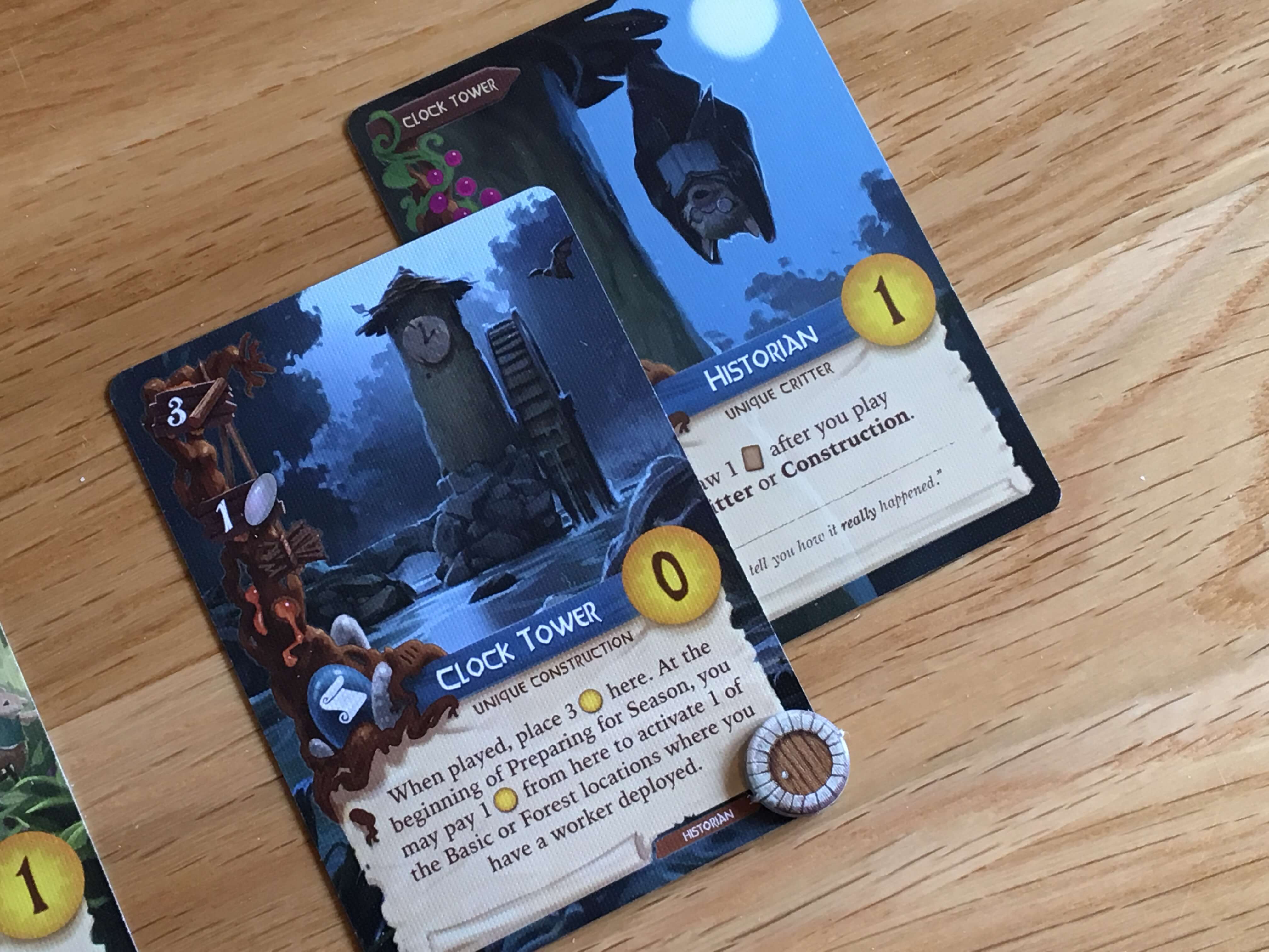 I’d show them now, except that the other side to Everdell, the side you can only experience (because it’s not really visible on the cards) is how deep the game is. I’ve played it with some of the best board gamers I know and we’ve had games that reached nearly a hundred points between the top players, yet there was only one or two points in it. We once had a game that was so tight, we drew on seventy three. Creating a game that has as many ways to win as Everdell does, but which remains as tight as it does is a real marvel.