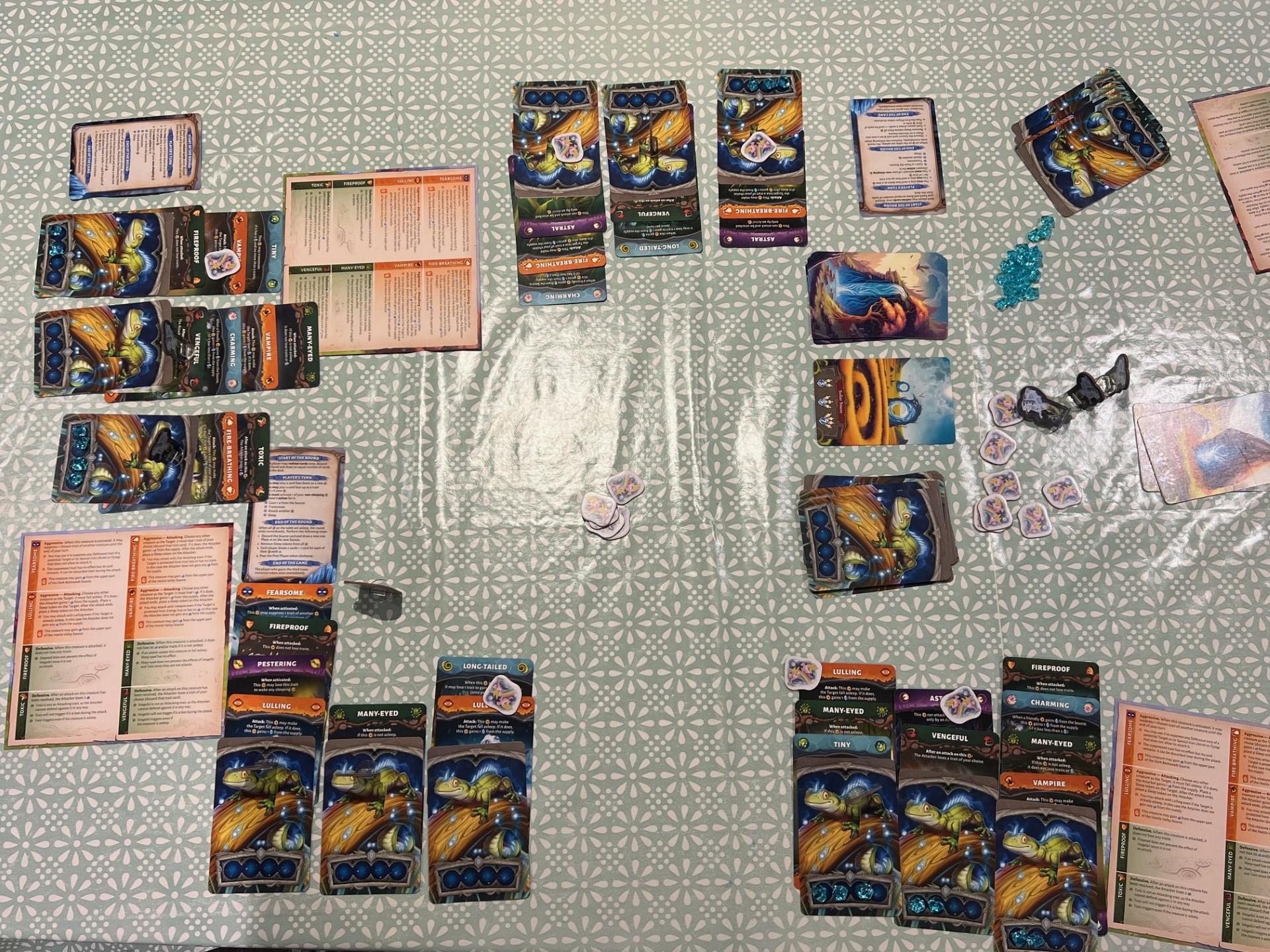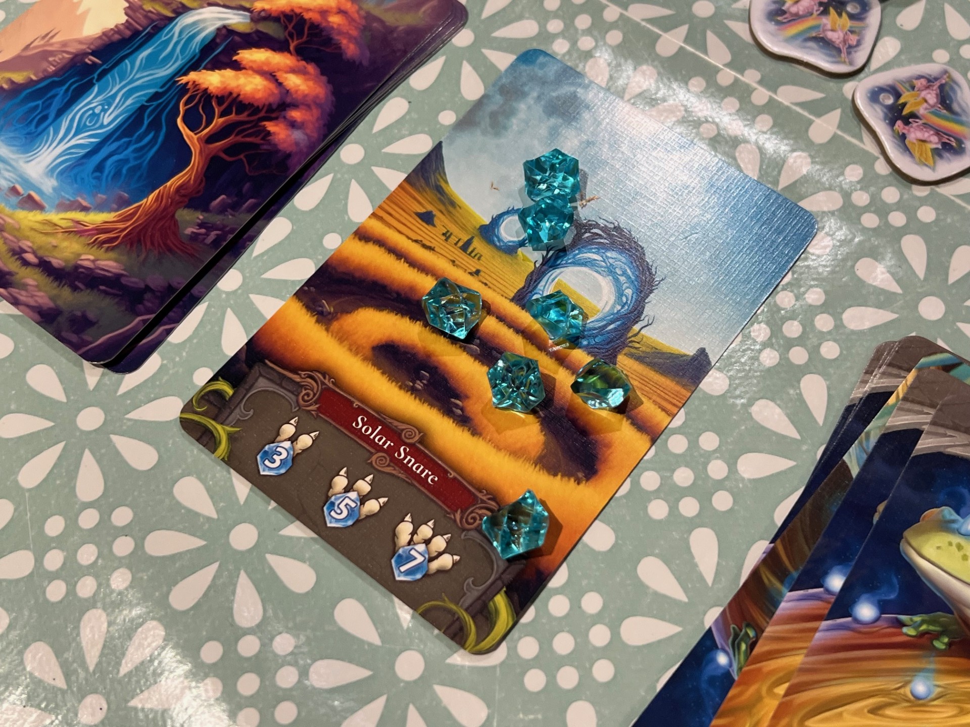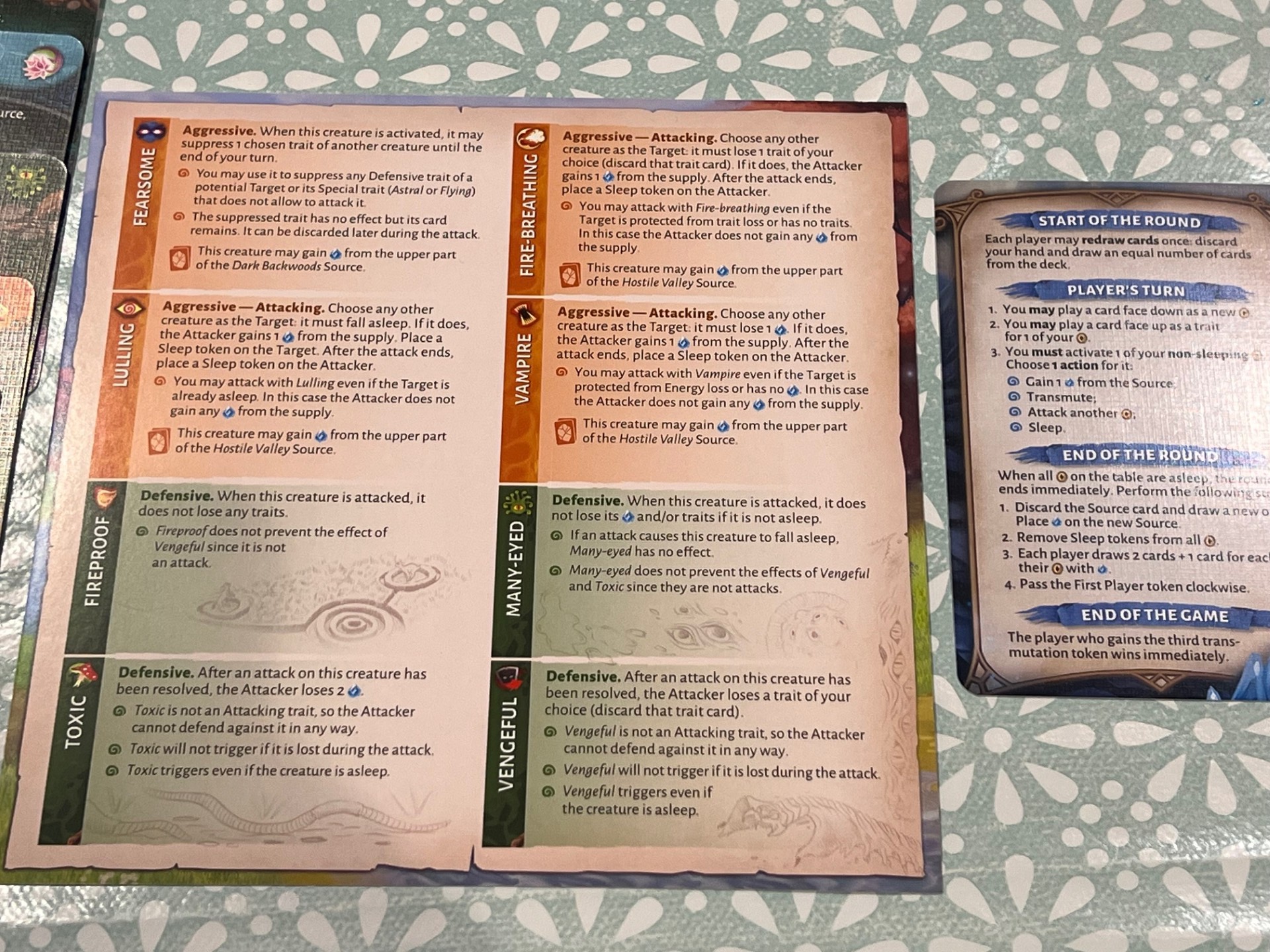 When all creatures are asleep, the current round ends, a new power source is flipped from the top of a deck of ten cards, and all the creatures wake up ready to take turns again. Most attack actions result in a creature falling asleep after — but will often either steal a crystal from the preyed upon species, or in some cases put that species to sleep, or even remove a trait from it. You’ll generally only choose to put your own creature to sleep when you have no other valid actions.
