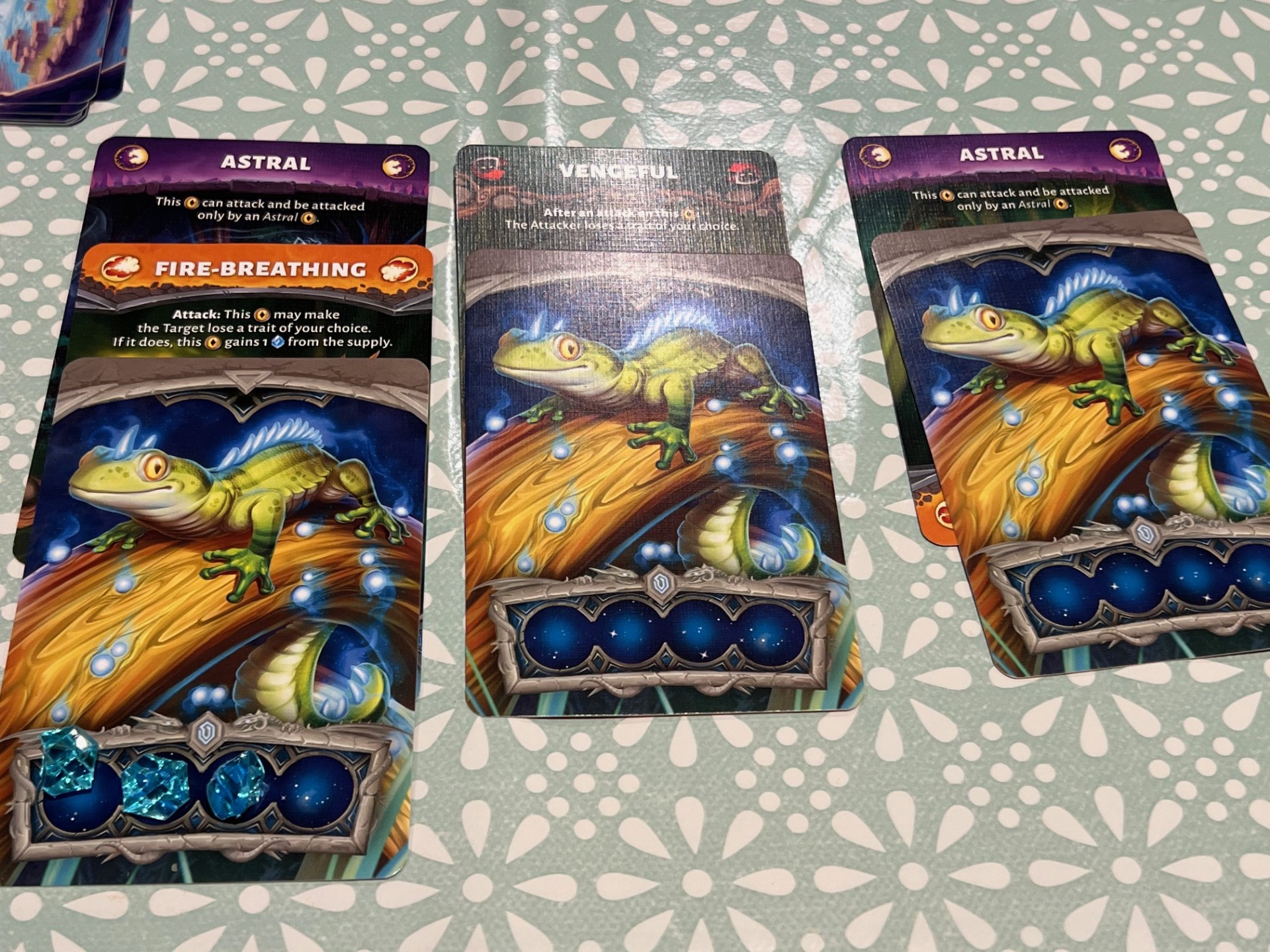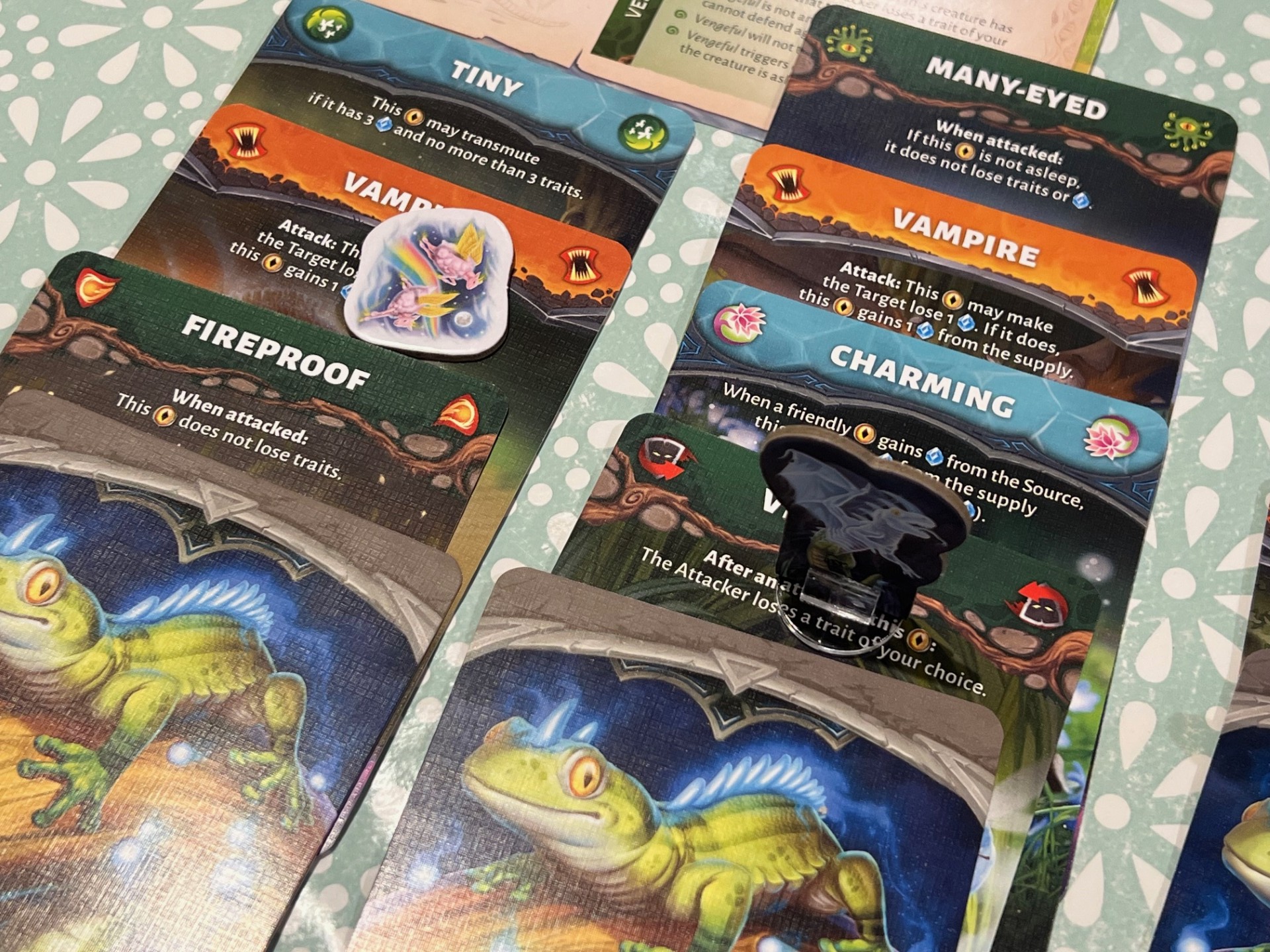 It doesn’t take long for the players to realise that defensive cards are absolutely essential, and even playing with my kids (both ten or under) it was clear within a few turns that a creature simply will not make it to transmutation without an appropriate defence. Some attacks are more effective than others (as are some defences) but in most cases a defensive card will make an attacker think twice, whilst still making attacks possible. For example, if you attack Creature X, you will get a crystal, but you’ll also have to discard a trait (and the player who you attacked will choose which one).