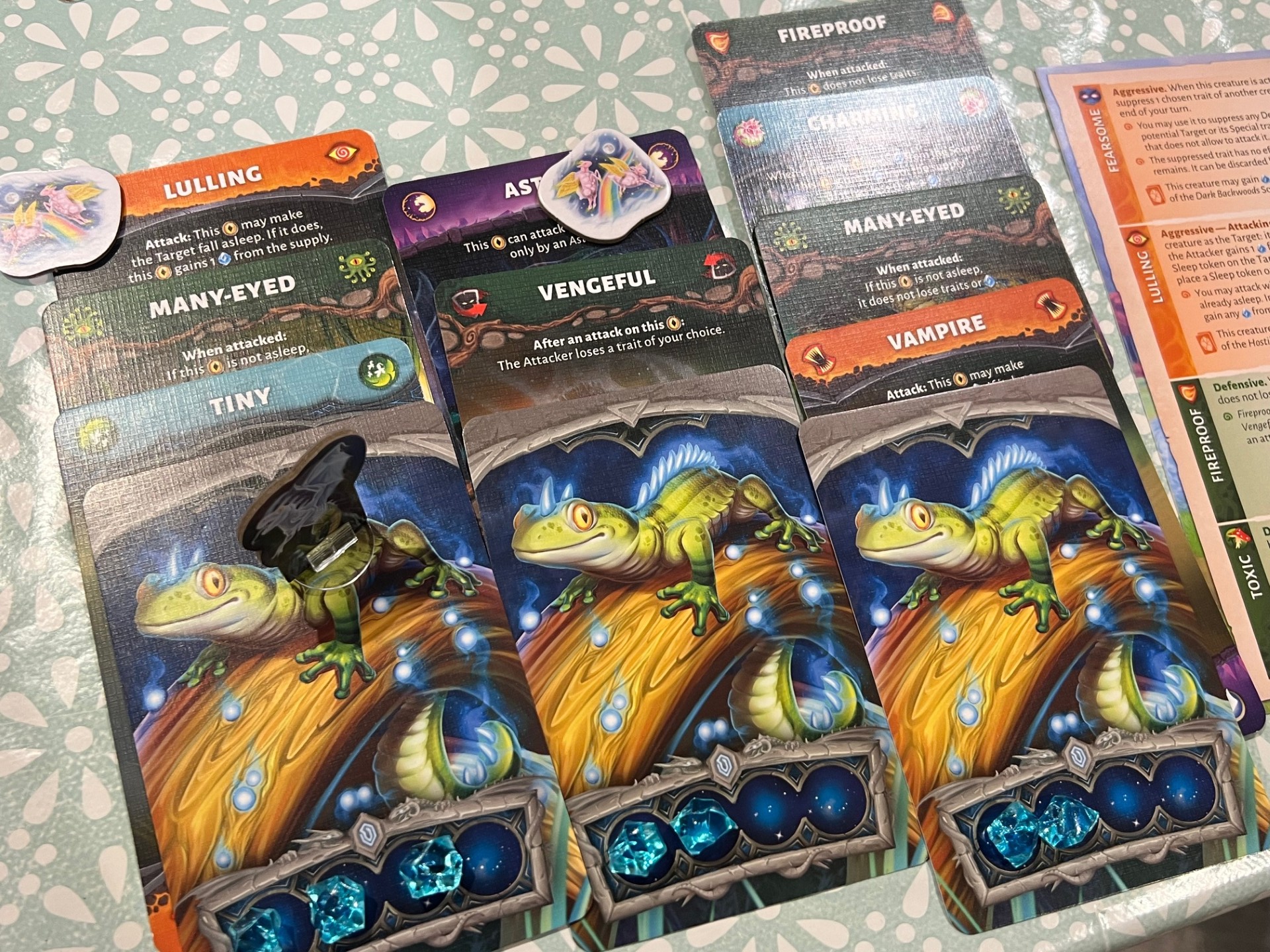 Traits broadly fall into four categories and the game includes useful glossary cards to help the players understand what each one does. The categories include attack cards, defensive cards, special cards and energetic cards. The first two kinds are broadly self-explanatory, offering methods to attack other creatures and to defend against them with attacks including Vampire (which steals a crystal), Fire-Breathing (which eradicates a trait and draws a crystal from the supply on success) and so on. Defensive cards punish attackers, or in some cases prevent attacks from happening at all.