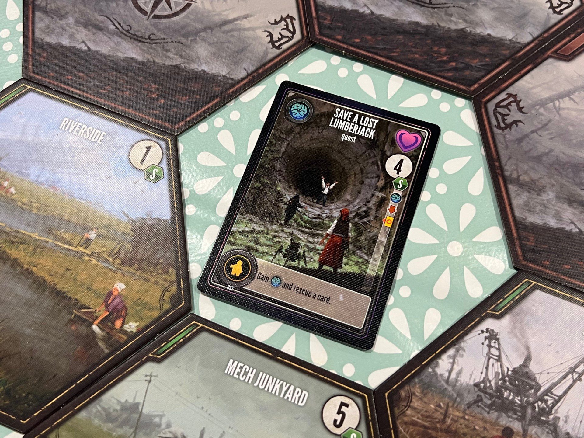 Moving is as simple as it sounds, allowing the player to move their mech between 1-3 spaces (normally) across the hex tiles that were placed during setup. The most southerly of these (the safe ones) are placed face up, but those in the centre and northern sections of the board must be flipped and explored when first visited.