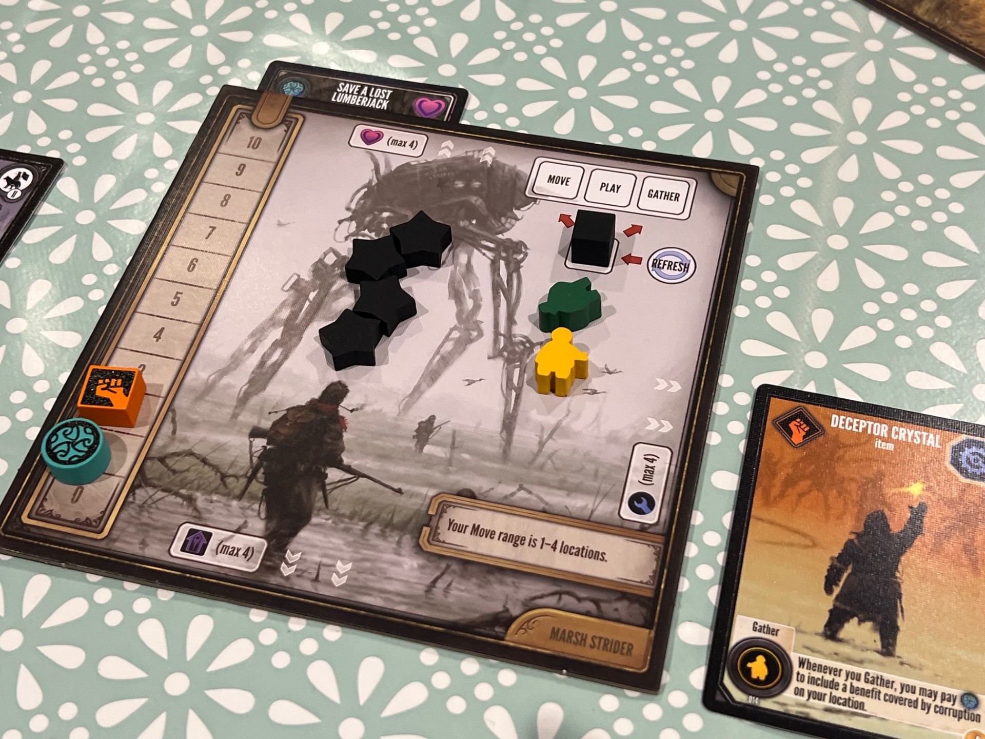 For me, this did click fairly well, but there is a bit of a disconnect between mechanics and theme. Each of the unexplored spaces will also reveal some number of corruption when flipped, and beneath that corruption, there will also be another action space that can be used with the gather action (which is in itself, a bit odd, but not insurmountable).