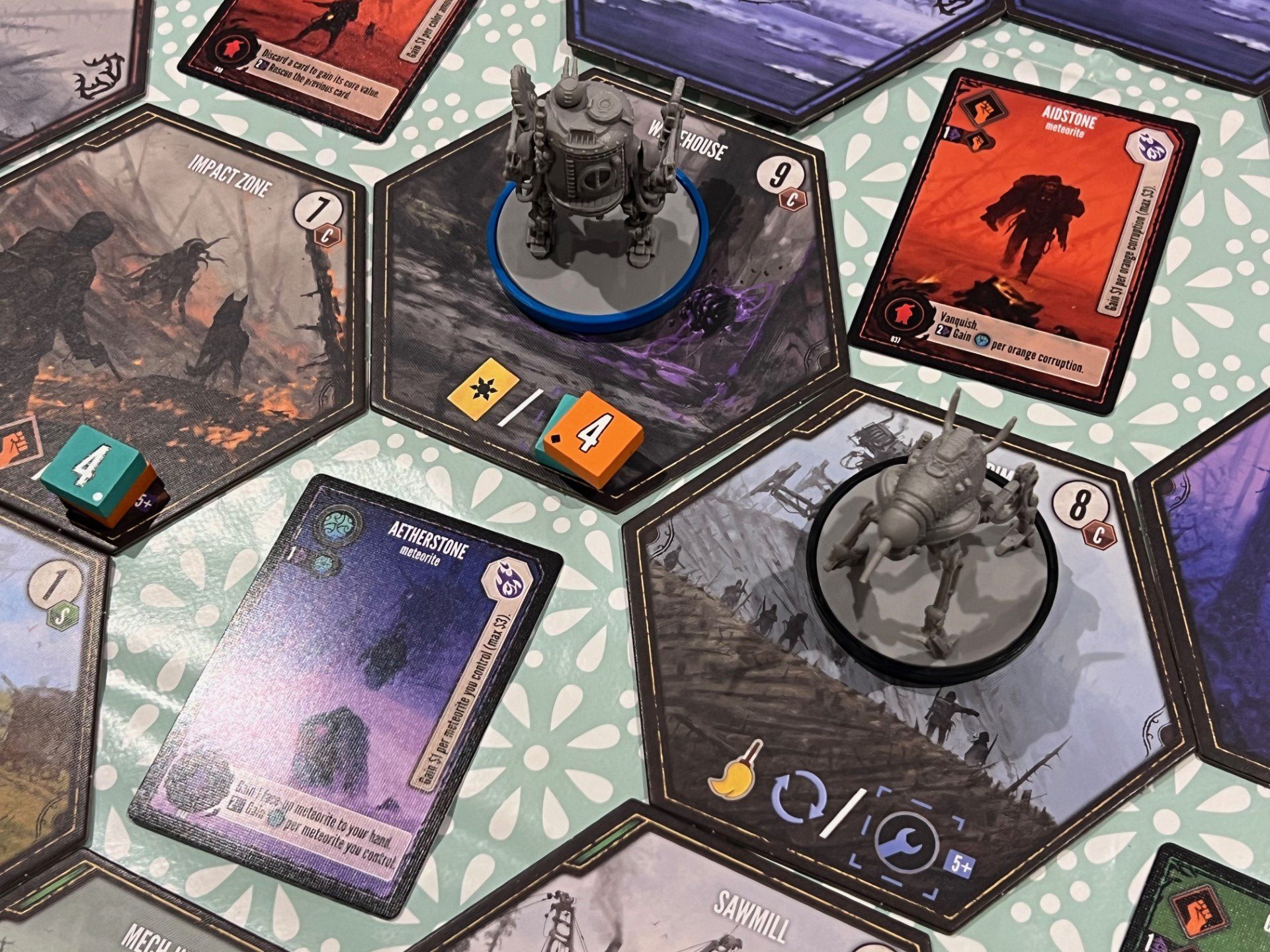 What I meant when I said that there is a disconnect between some of these elements is that Expeditions presents its alternate history (now with extra-terrestrials) well, (especially thanks again to the art of Jacob Rozalski) but it doesn’t have anything much to do with what’s happening on the board. What is this corruption? Why is it so deadly to everyone else who has visited the Volga but not to us? Why does it not attack or advance in any way to threaten the players?