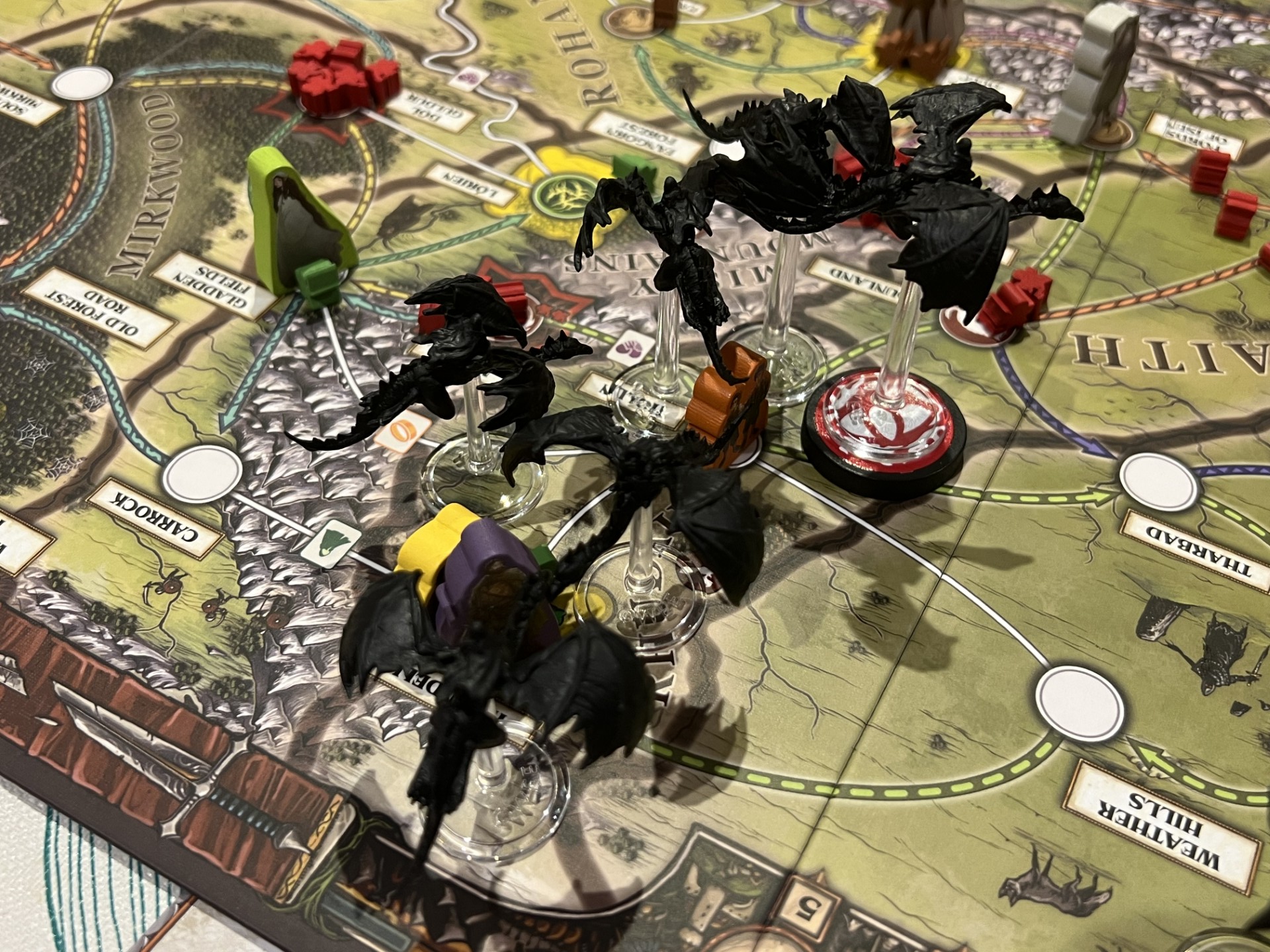 Speaking of the board — it’s really, really nice. A sprawling map of Middle-earth, rendered in rich detail, with key locations like Helm’s Deep, Minas Tirith, and Mount Doom all clearly marked, along with many lesser locations that still have thematic ties to the books and movies. The small wooden troops fit perfectly into the spaces, and the printed character meeples add a splash of personality. Then there are the Nazgûl — plastic, floating and ominous – they don’t just look good, they look dangerous.