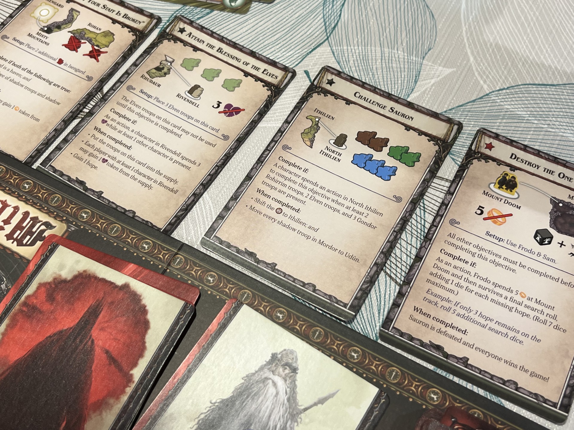 Each game presents a different set of objectives — drawn from 24 in total — along with a significant number of characters to choose from. That’s a lot of variety, and it means no two games feel the same. The main (and arguably only) loss condition in The Lord of the Rings: Fate of the Fellowship is the hope track dropping to zero, but objectives such as rallying the elves, crushing Isengard, bringing leadership to Gondor or even redeeming Boromir all add thematic flavour and mechanical support.