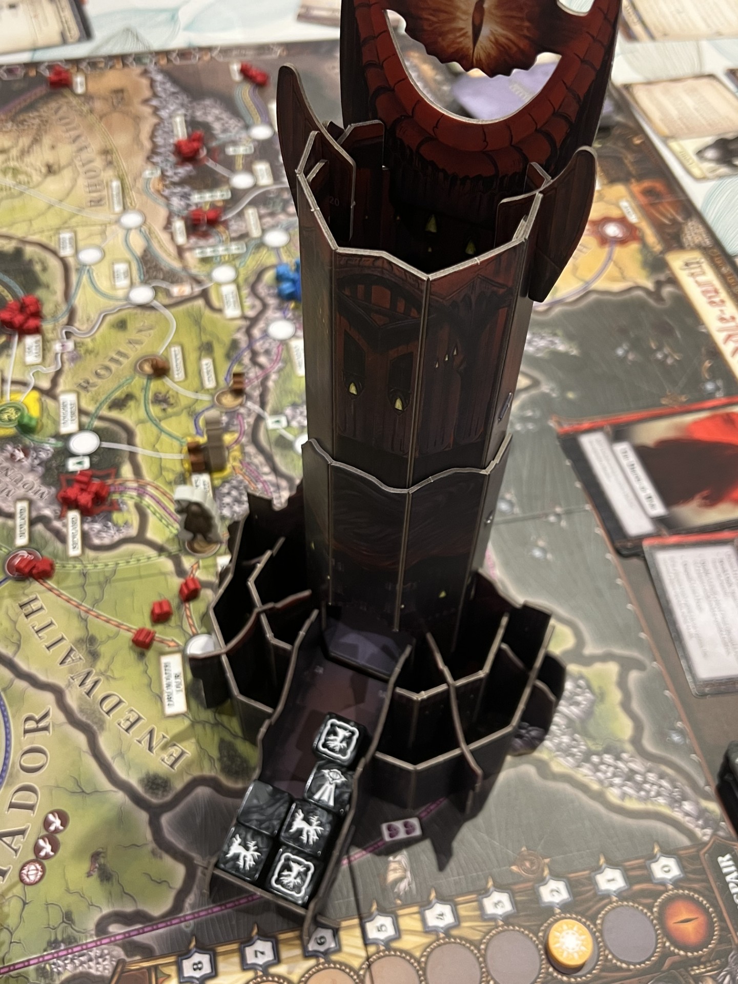 Component quality in The Lord of the Rings: Fate of the Fellowship is top-tier. The board is sturdy, the cards are well-printed, and the custom dice are chunky and satisfying. The character meeples are printed with unique art, and the Nazgûl miniatures add a touch of menace. The dice tower is a standout — it’s functional, thematic, and surprisingly durable. It’s the kind of component that elevates the whole experience.