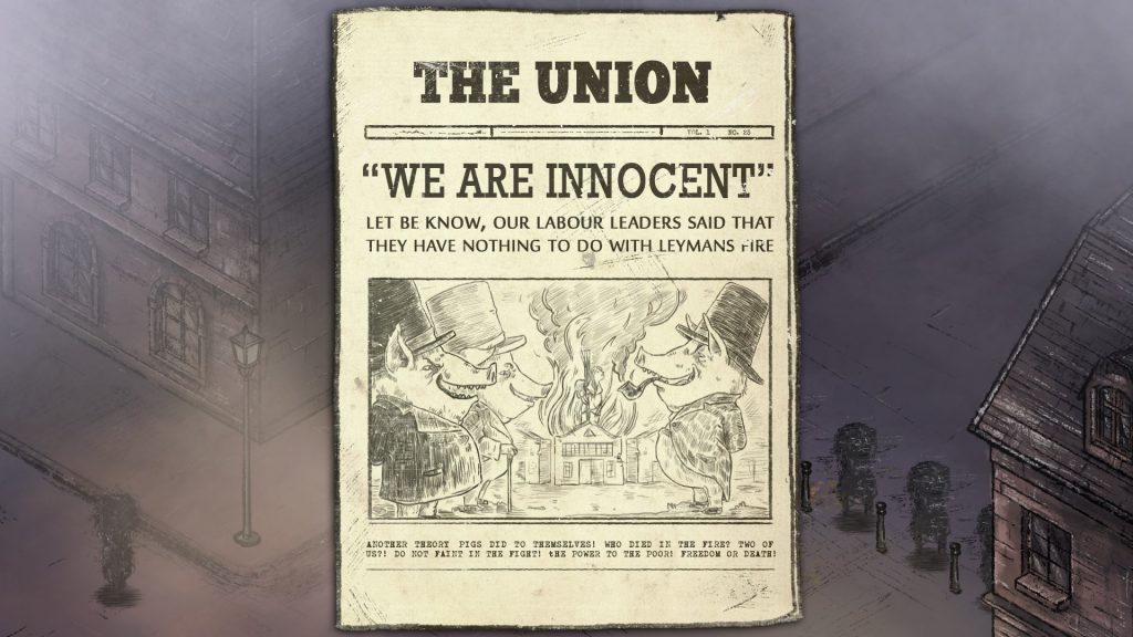 I played about an hour of the game, most of which served as an introduction to the social layer of the game. A rivalry between the salesman of a mainstream paper versus a young, cigarette smoking pre-teen selling a rag targeted at the workers served as the introduction to the class divide. A recent fire headlined both party’s papers, telling of a large factory fire. One paper sympathising with the factory owner, blaming workers for the blaze, while the other focused on the poor mother who died in the incident and how it could have been stopped were the factory owners more responsible. These starting interactions put the young scamp on the offensive, and they actually start laying into you until you identify yourself as a new, neutral party; that said, the other salesman is very quick to recommend you report his competitor to the police for them.