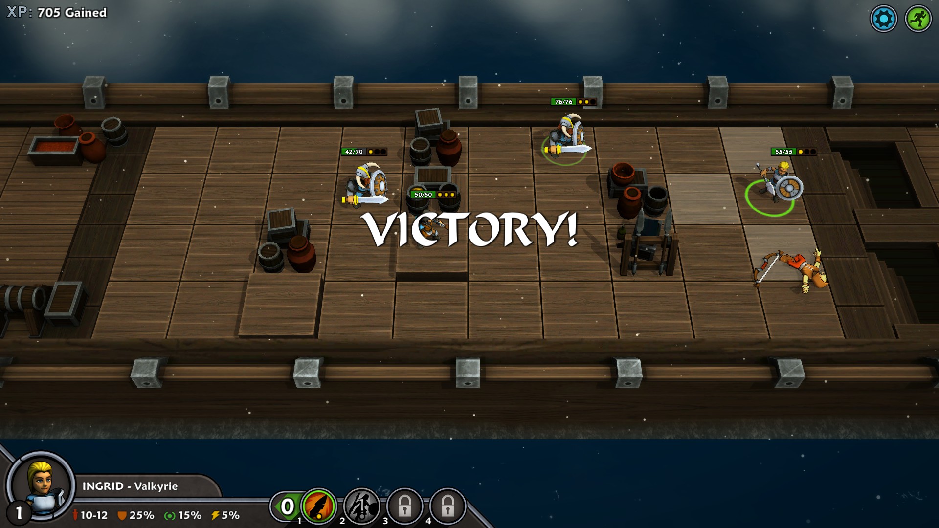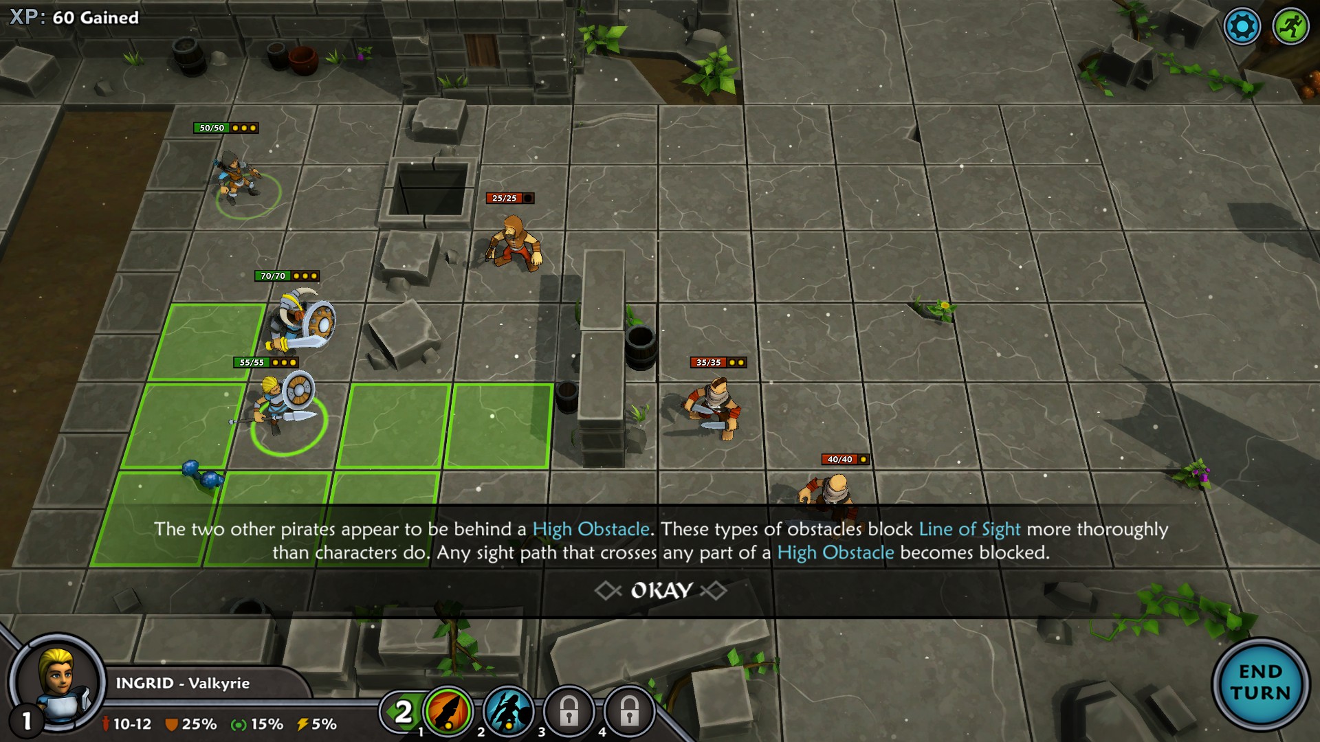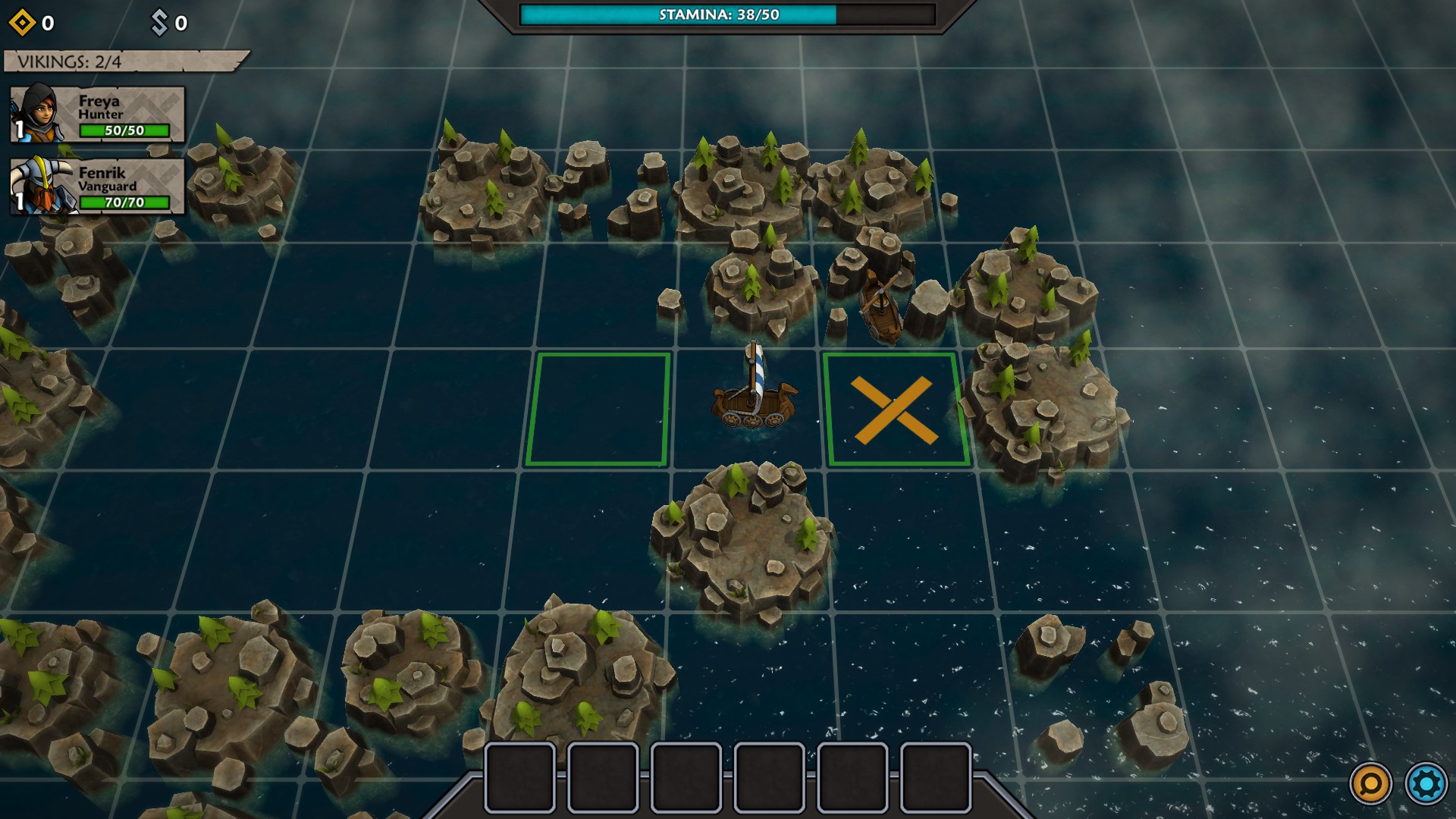 Interestingly, most of your turns are not consumed on the map! The majority of your time in Iron Tides is spent during battles. Strategic fighting is the mead and food of Iron Tides (like ‘meat and potatoes’—sorry, I’ll try harder). Whether you are confronting pirates, outposts, or other various non-spoilery predicaments, the incursions are where this game shines the most. Since you are usually outnumbered, you must figure out the most efficient way of defeating your increasingly tougher foes without getting your own troops killed. Each skirmish also contains various low obstacles, which block movement, but not Line of Sight, and higher obstacles that block both traverse and LoS.