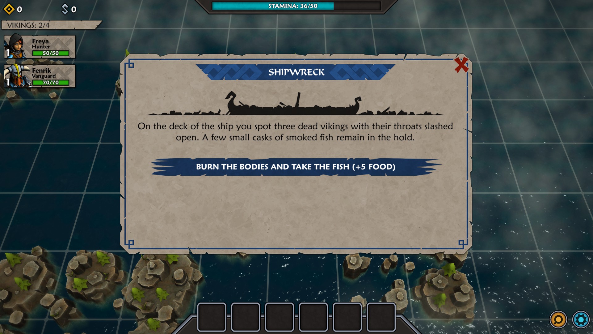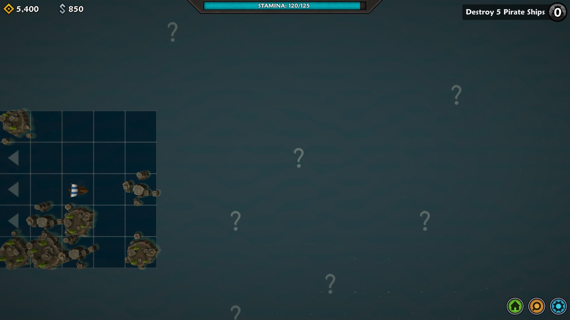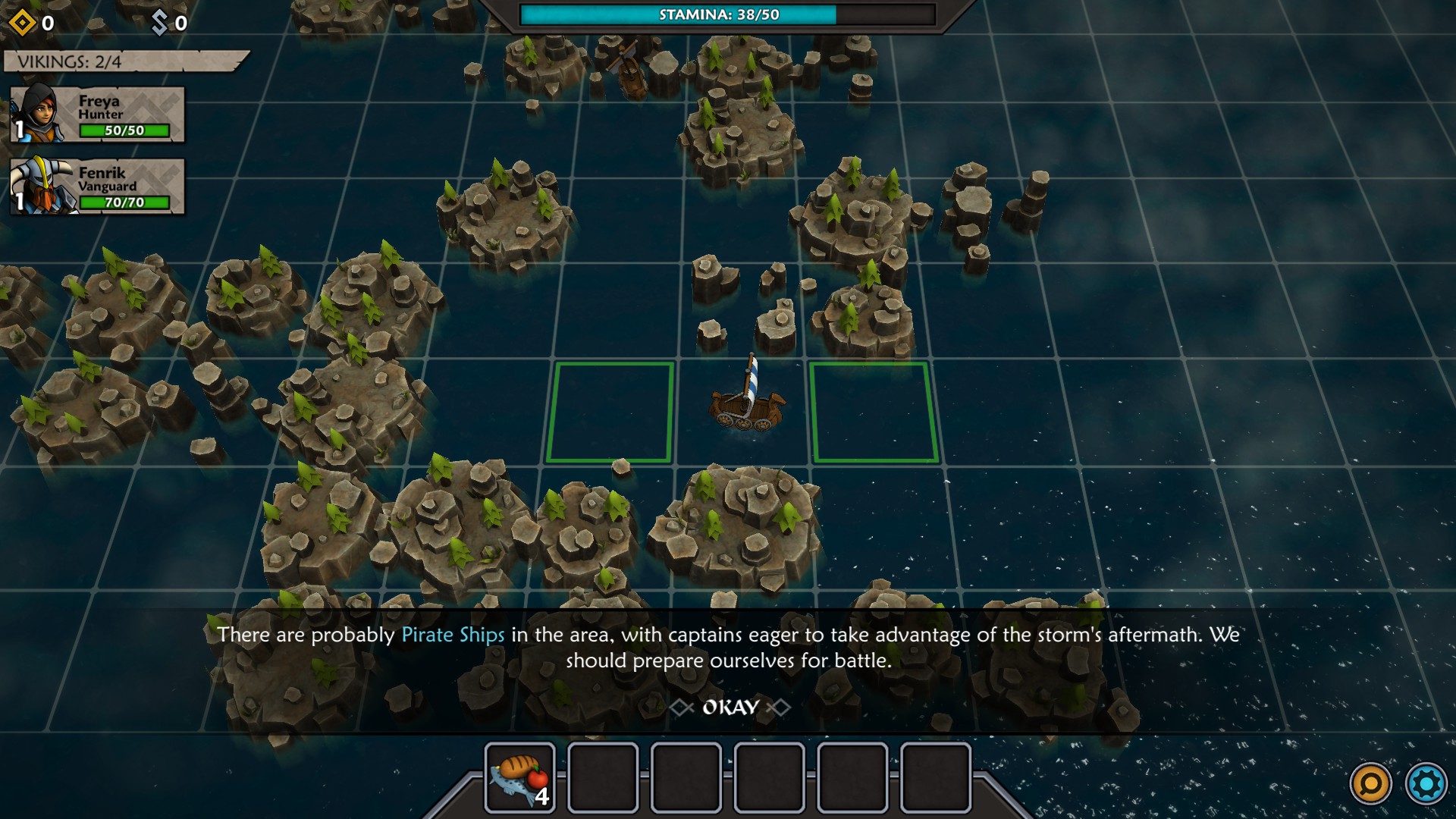 The map for Iron Tides is square-based and heavily shrouded with fog of war. You might think you could easily move from one square to the next until you run across an encounter, but that is where the first massive wrinkle comes into play. Each square you move into causes loss of stamina within the crew. When you run out of stamina, your crew will start to become hungry which will wreak severe damage to them. Then, if your crewmen/fighters go into battle hungry, they will start already injured. So, as carefully as possible (since you never know when your path will be blocked), you have to ease from square to square while always watching your stamina level. Between missions, you need to make sure and buy some food at Norhaven (which is your base of operations). During your travels, you might find food, or receive some as a reward for battles, however it is something you must pay careful attention to and, more importantly, plan ahead for accordingly.