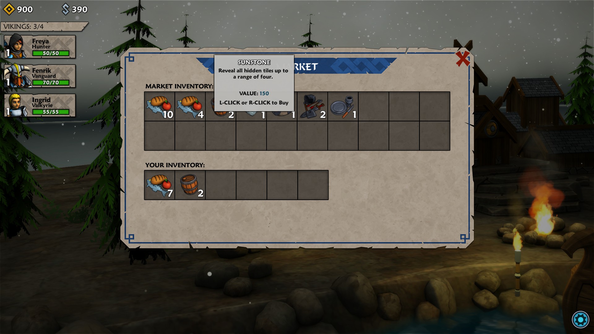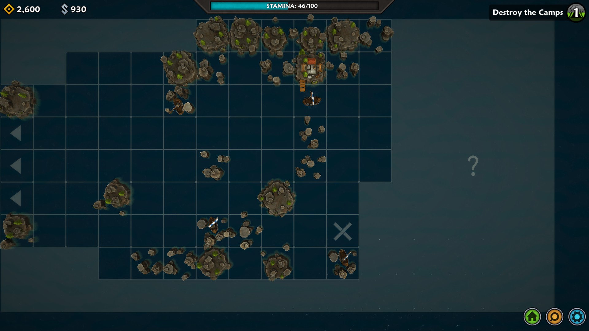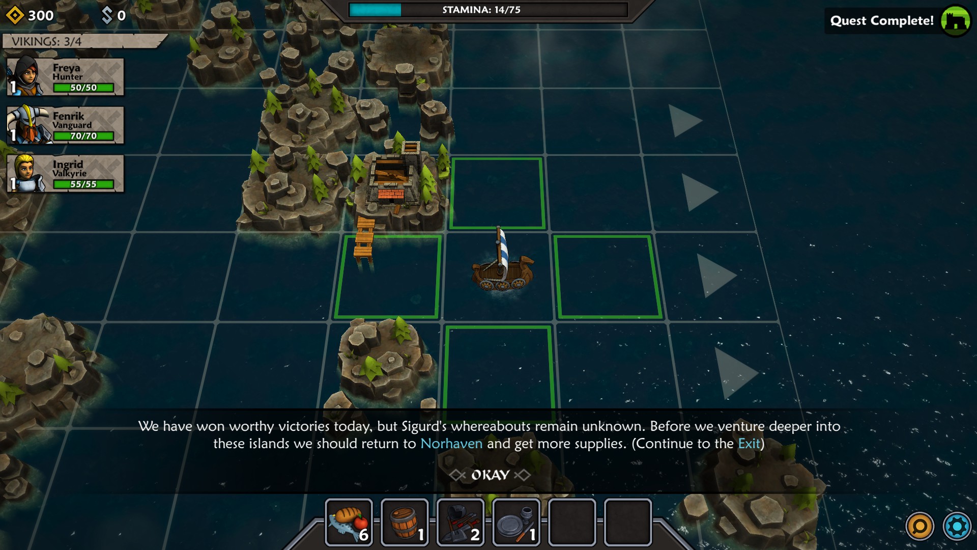 The map for Iron Tides is square-based and heavily shrouded with fog of war. You might think you could easily move from one square to the next until you run across an encounter, but that is where the first massive wrinkle comes into play. Each square you move into causes loss of stamina within the crew. When you run out of stamina, your crew will start to become hungry which will wreak severe damage to them. Then, if your crewmen/fighters go into battle hungry, they will start already injured. So, as carefully as possible (since you never know when your path will be blocked), you have to ease from square to square while always watching your stamina level. Between missions, you need to make sure and buy some food at Norhaven (which is your base of operations). During your travels, you might find food, or receive some as a reward for battles, however it is something you must pay careful attention to and, more importantly, plan ahead for accordingly.