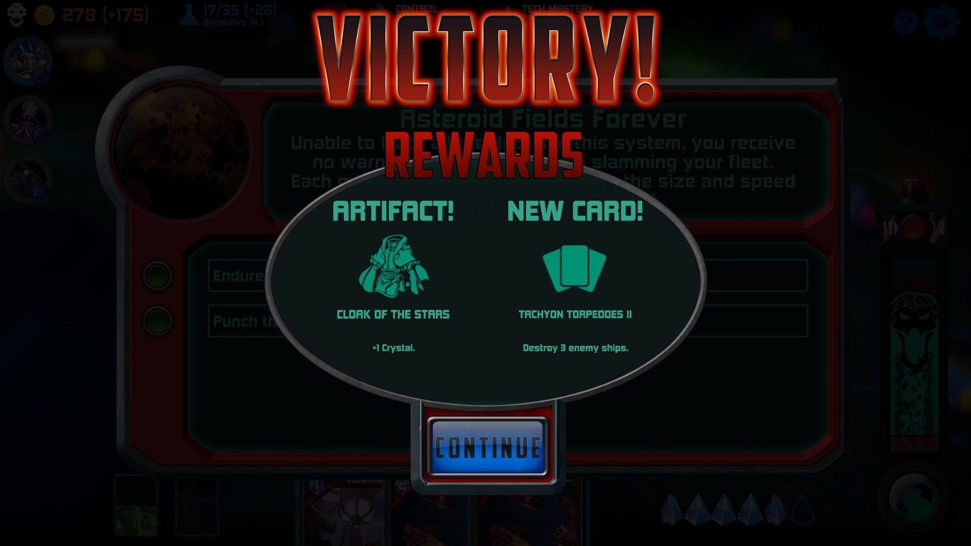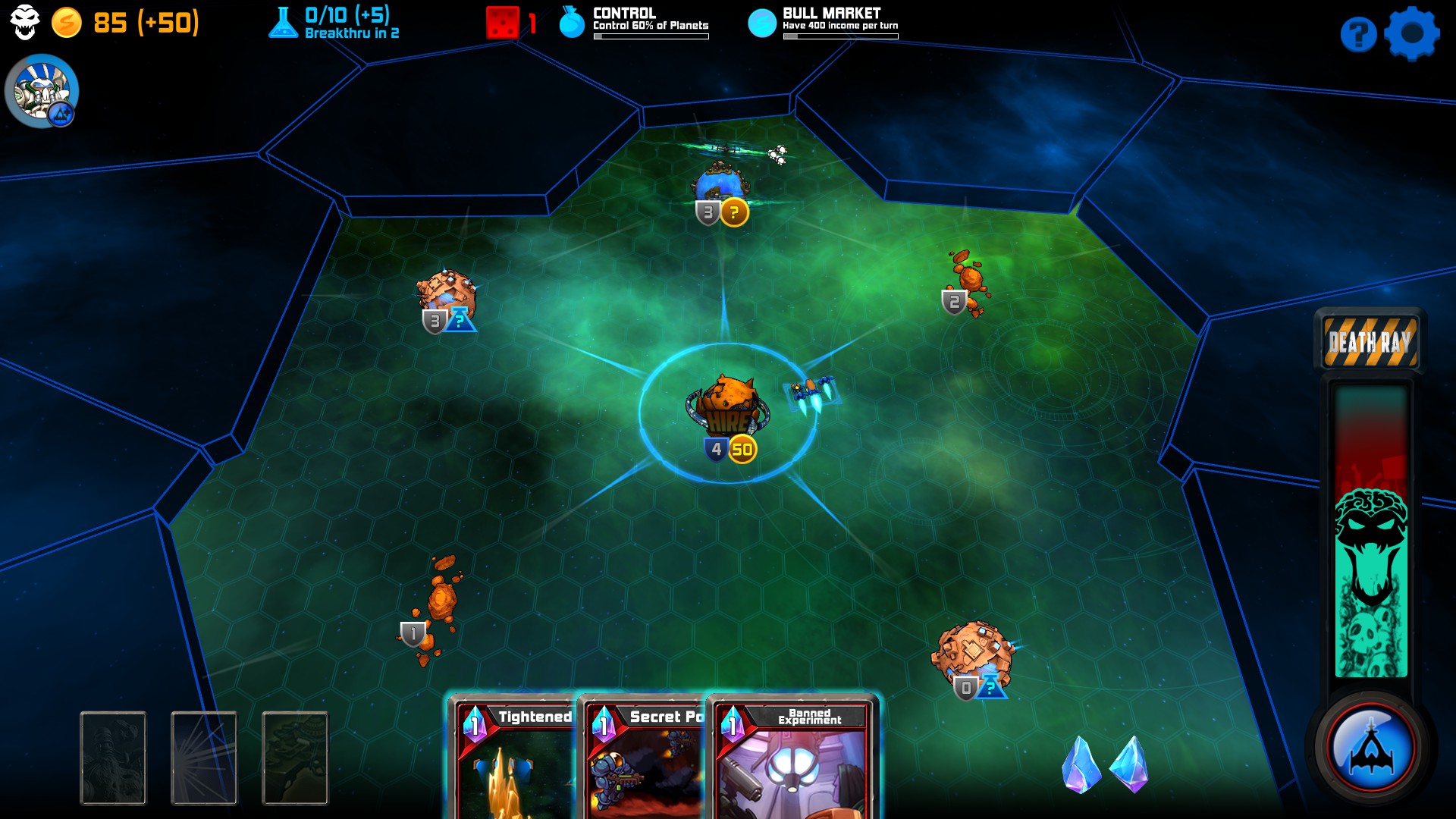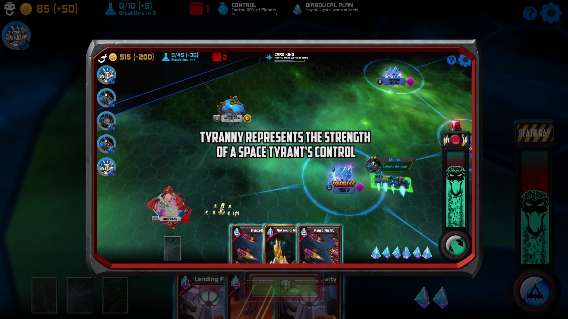 Another huge part of the game are the Cards that you earn and have in your hand. Some cards are played instantly, while for others, you will have to target a fleet or planet (some for your own, others for enemy’s). Cards’ playability are determined by how many crystals you control. Just like gold and research, certain entities that you control produce crystals. Space Tyrant has a wide variety of cards as well as differing costs to play each one. As with other perks, more cards are added to the deck the further along you progress.