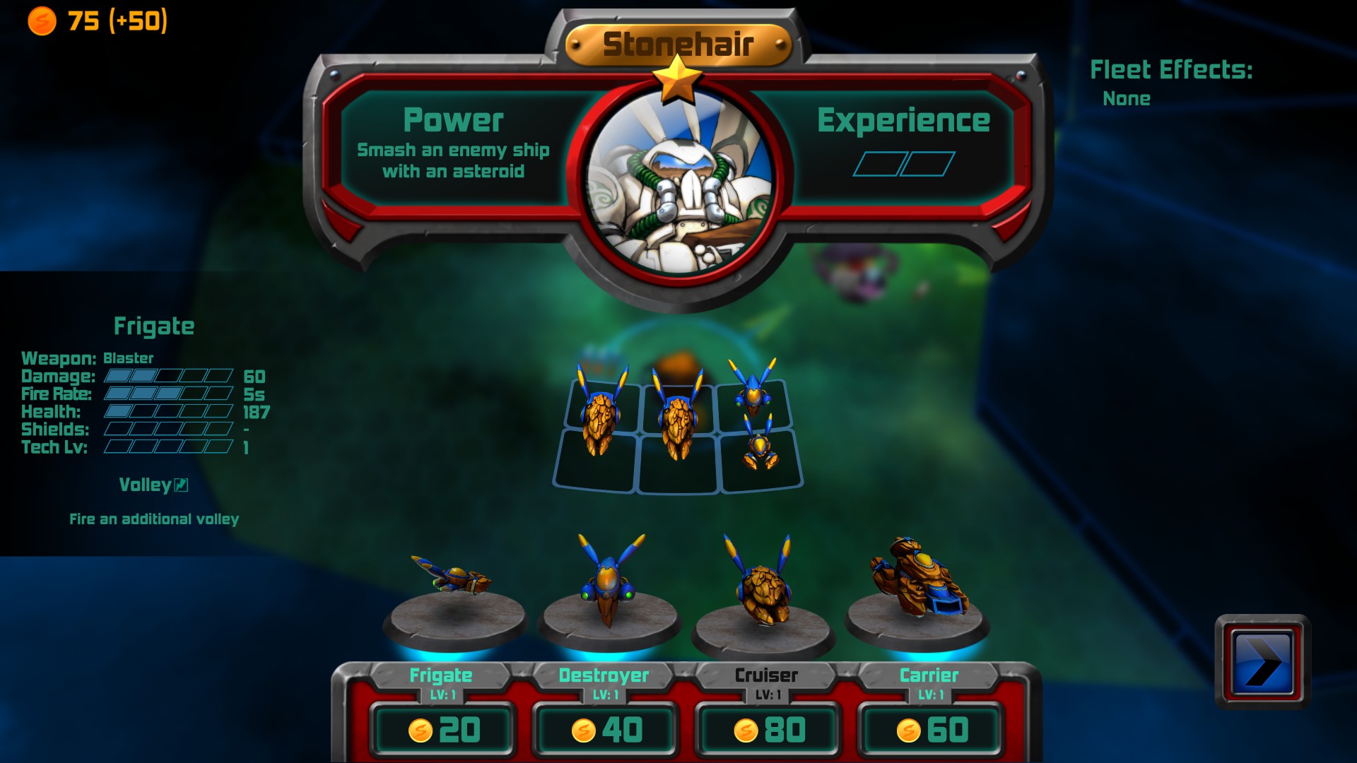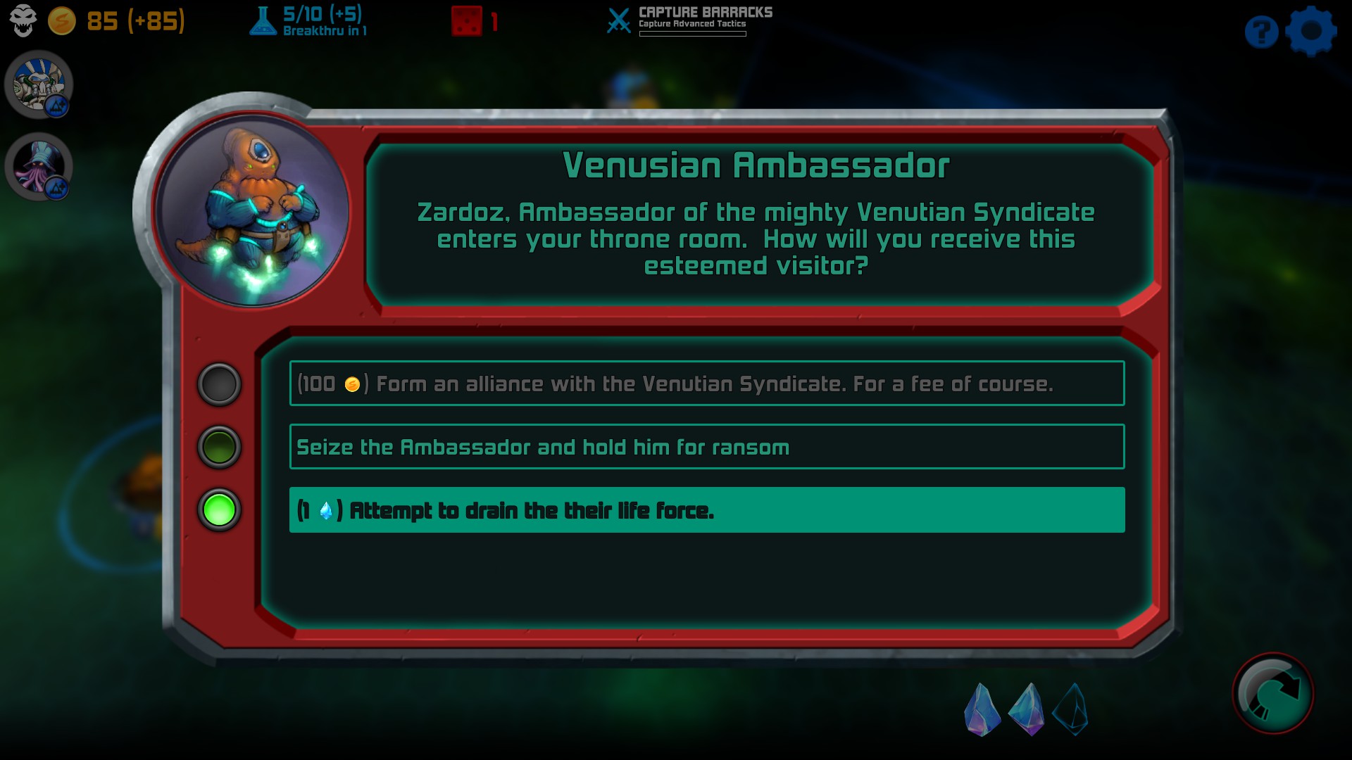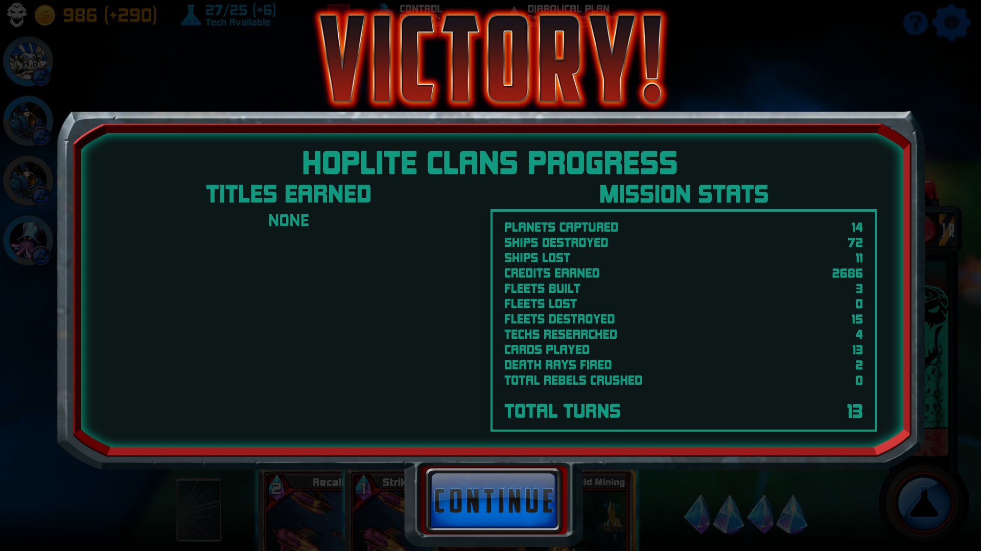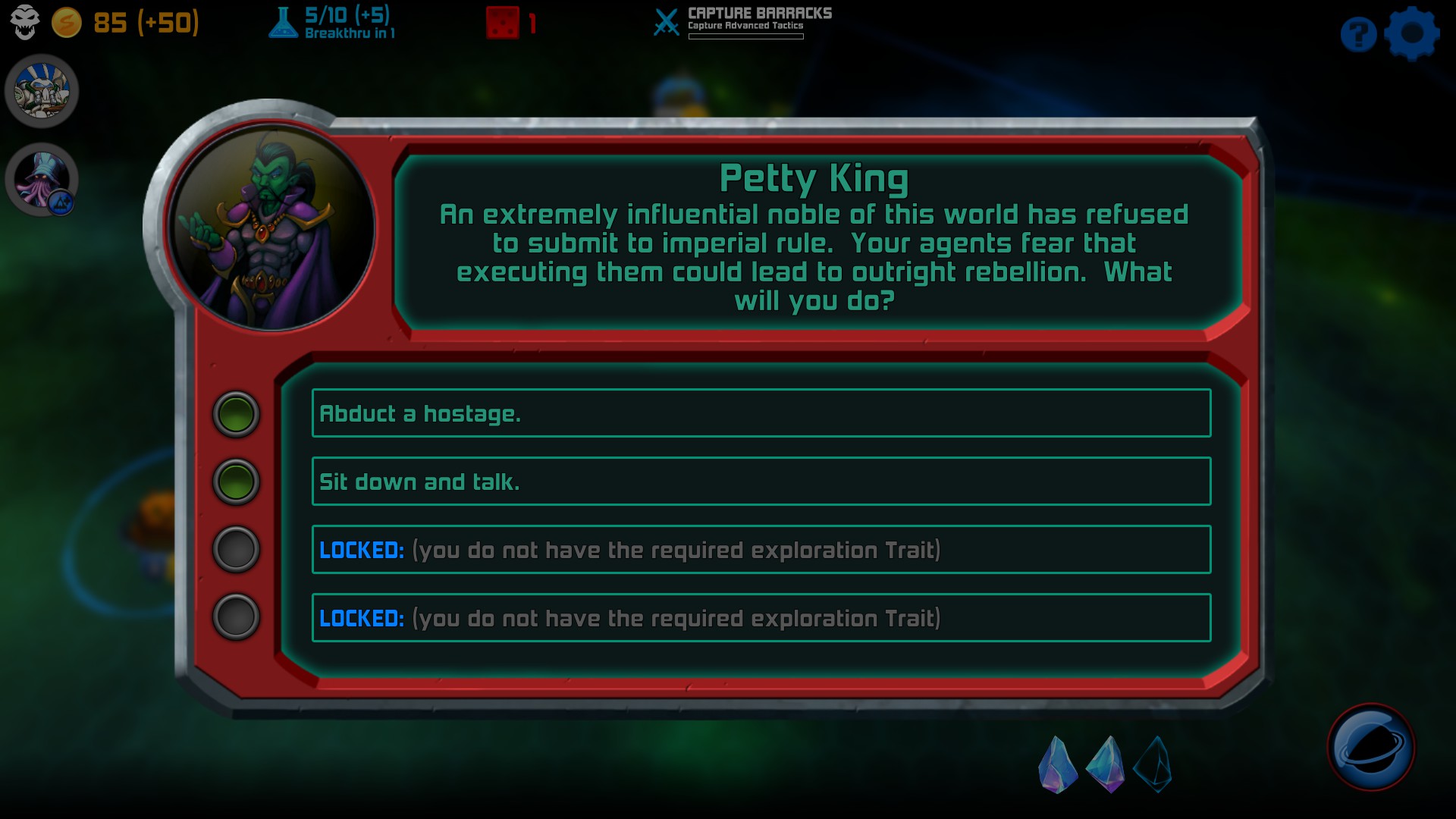 Another huge part of the game are the Cards that you earn and have in your hand. Some cards are played instantly, while for others, you will have to target a fleet or planet (some for your own, others for enemy’s). Cards’ playability are determined by how many crystals you control. Just like gold and research, certain entities that you control produce crystals. Space Tyrant has a wide variety of cards as well as differing costs to play each one. As with other perks, more cards are added to the deck the further along you progress.