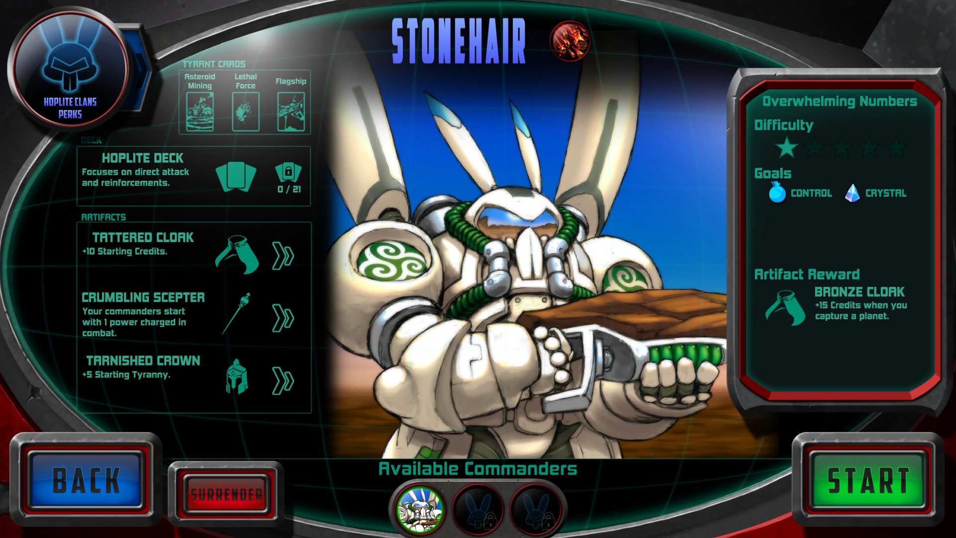 When you begin Space Tyrant, you have a single commander, a small fleet, and a home planet. You are taken to a mission screen to select your first mission (of two options, at the beginning of the game anyway). Missions generally have two components, but you only have to fulfill one to clear the sector. It is an either/or situation. By completing one of them, that will grant you a victory for that sector of space. (e.g. reach a research production level, conquer a certain amount of planets, etc.) Then you go to the map where you will slowly conquer planets, asteroids, etc. until reaching one of the goals.