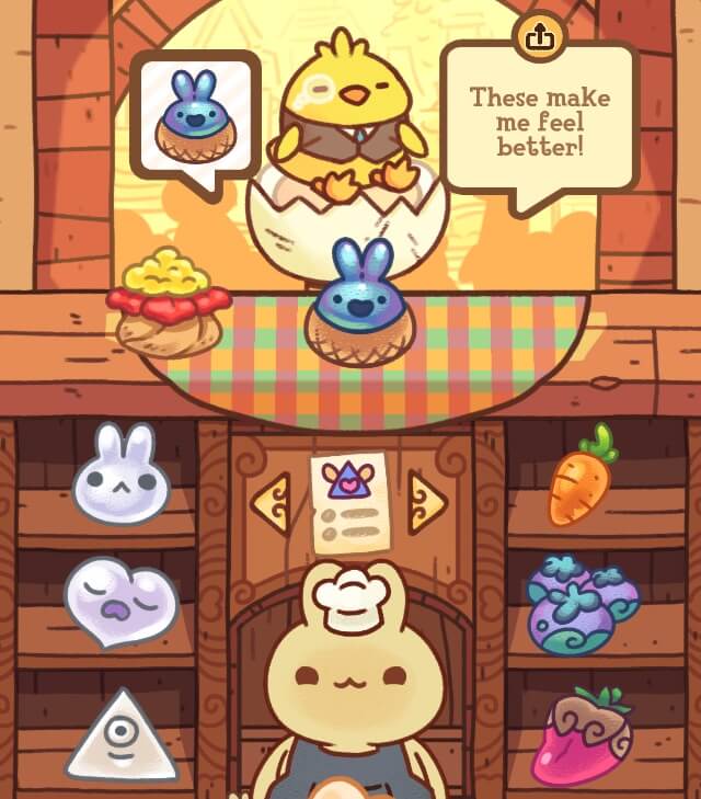 Bunnybuns puts you in the shoes of a bunny who owns a small bakery and wants to make some dough. You serve a colorful cast of characters who each have their own charm. Your customers ask for specific pastries that you must create by combining ingredients from your kitchen. Ingredients come in two forms: feelings and fillings. Feelings are essentially just shapes that the pastries can come in, and fillings are ingredients that determine the color and sometimes texture of the pastries. Usually, customers request specific pastries, and you must determine which feeling and filling will combine to create the desired dessert. However, sometimes customers just request a certain feeling with a filling of your own choice, or vice versa.