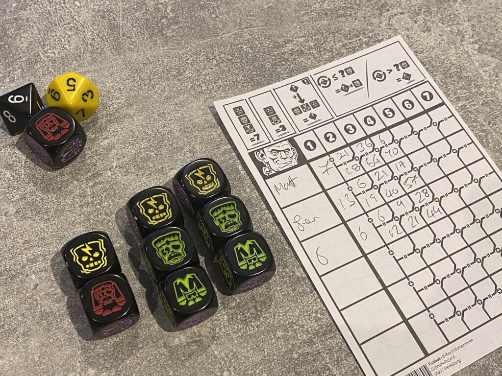 There are two different coloured Franky constructs to make, with one requiring only two dice and the other three. The more of a given Franky you can complete, the more points you’ll score. The eight and ten-sided dice provide more complex scoring options, with elements of push your luck and gambling thrown into the mix.