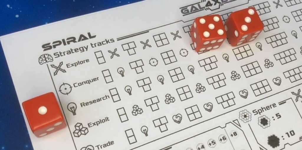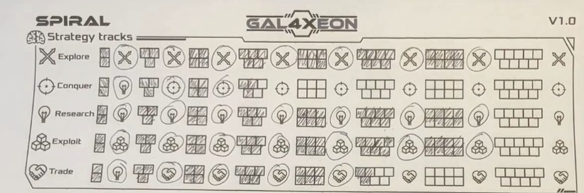 Gal4Xeon asks you to roll three D6 dice and all players will use the numbers rolled for this round. How you each spend those dice however, is totally up to you. You will spend the numbers on three Strategy tracks. The tracks are Explore, Conquer, Research, Exploit and Trade.