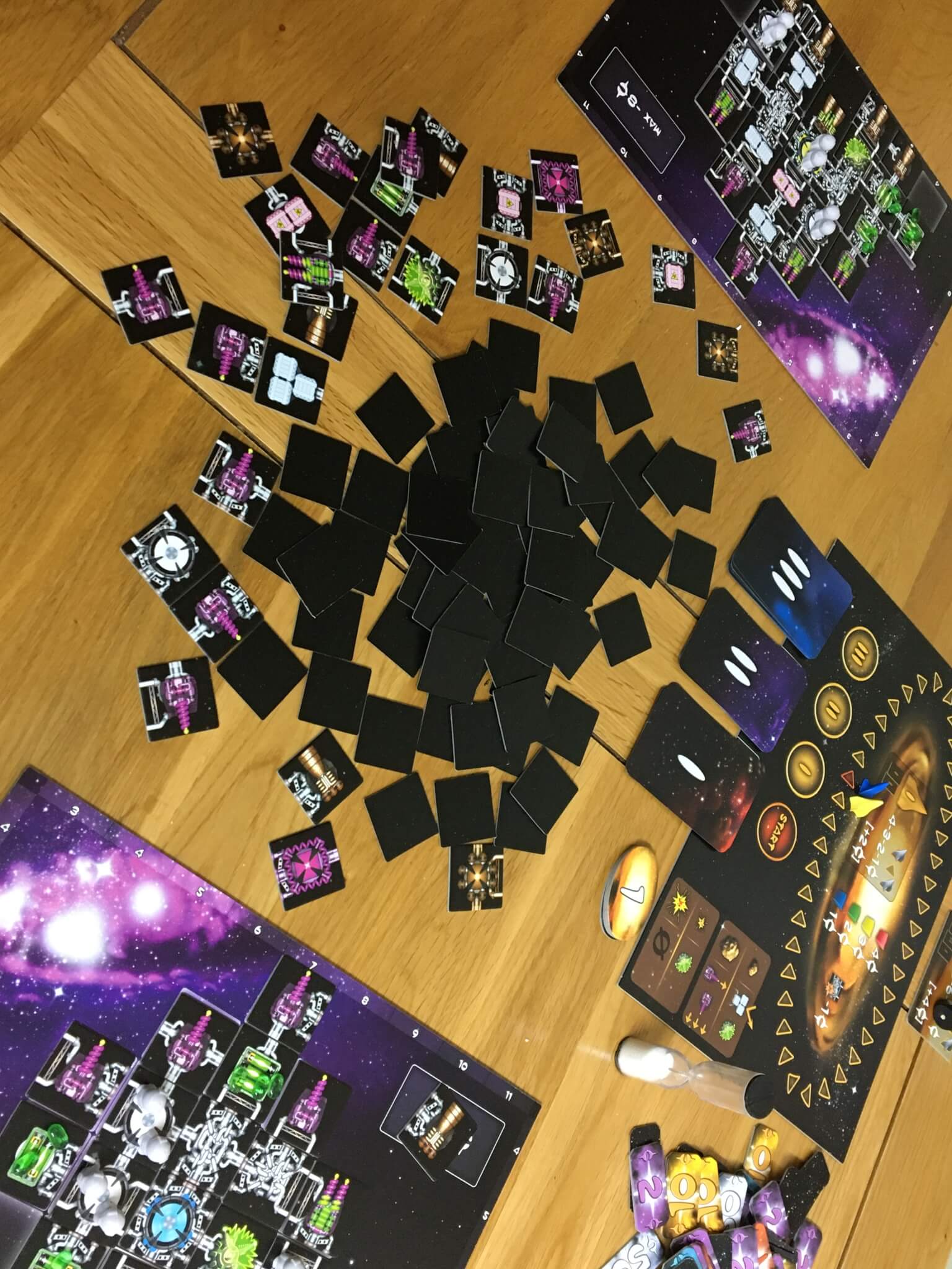 As players grab the pieces and move them onto their ships, they can reserve up to two pieces for later in the build by placing them onto their boards, however should they not use those pieces, a penalty must be paid. Other pieces that are picked up but not used can be placed back on the table face up, but may then be taken by any player. As players complete their ships (with engines, weapons, crew and cargo compartments and more) then they declare themselves finished and take a turn order token. A sand timer can be used during this process to add a further sense of urgency.
