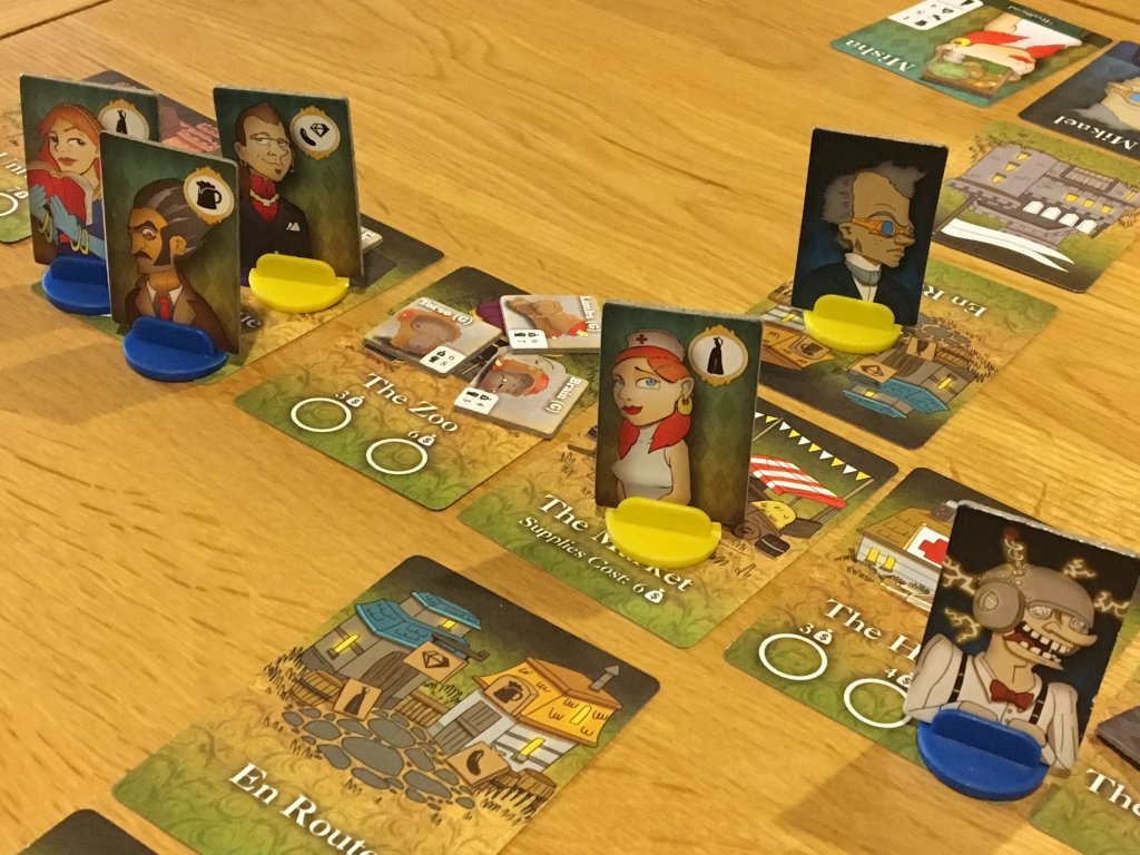 During setup, the players will choose their doctor and their assistants, then they’ll prepare the town by placing seven cards out onto the table, each of which represents a location. The doctors each have a home base card and a location that indicates that they are travelling. The town itself will be set up with a number of body parts on each location, which is determined by player count.