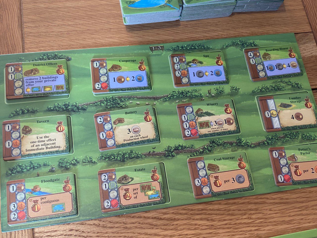 This actually leads to some interesting scenarios, and in most cases (the solo game aside, where cards have to be exhausted for one round before they can be used again) there are two or three ways to get a particular resource, clear a forest, or build a building, which does mean that considering opponents’ strategies is a valid thought stream. In most complete rounds of card play, a player will usually get enough actions to do all — or almost all — of what they want, but will usually have to think flexibly. Huge turns where everything goes to plan are rare, and I generally found that I enjoyed how well balanced Glass Road felt to play.