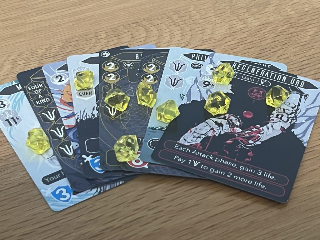 Return of the Dragon Gods offers a plethora of dragon themed options that increase your destructive arsenal. First among these are upgradable cards, veilstone crystals can be spent to increase the stats of these cards. Some cards can even be upgraded multiple times if you can keep the crystals coming every round leading to some real powerhouse creations. This leaves the player with an interesting choice: go wide and play as many cards as possible or focus on generating veilstones to build up a few cards into game breaking titans.