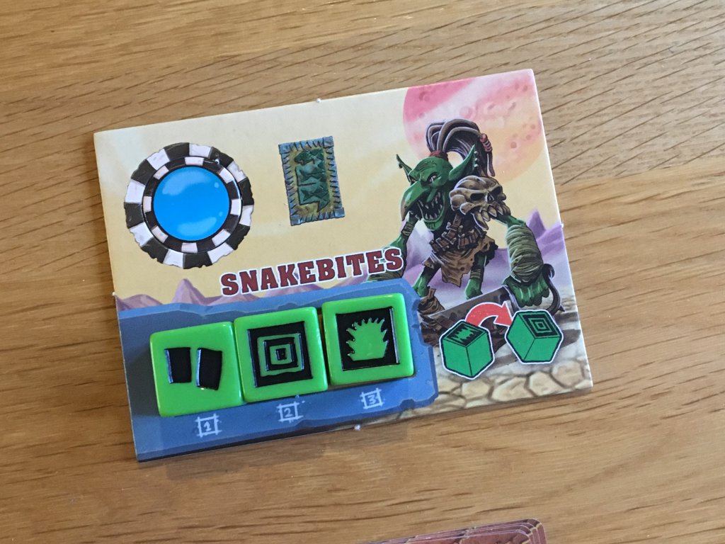 The first player to have three dice that are satisfactory will shout “WAARGH!” (I’m not joking) and all players stop with whatever dice they have. These dice can then be placed into the clan card in any order, but players must bear in mind that they will also be resolved in that order.