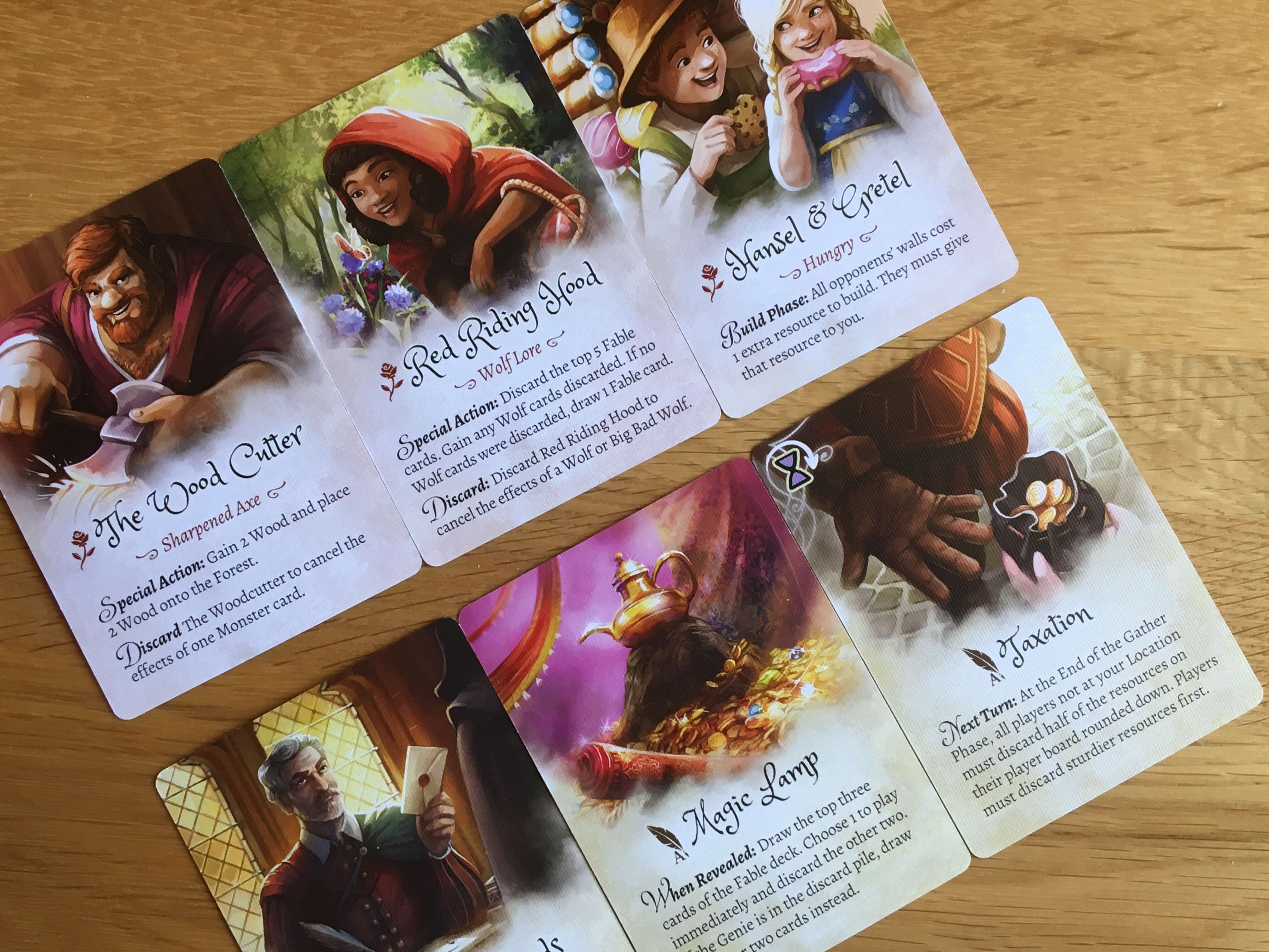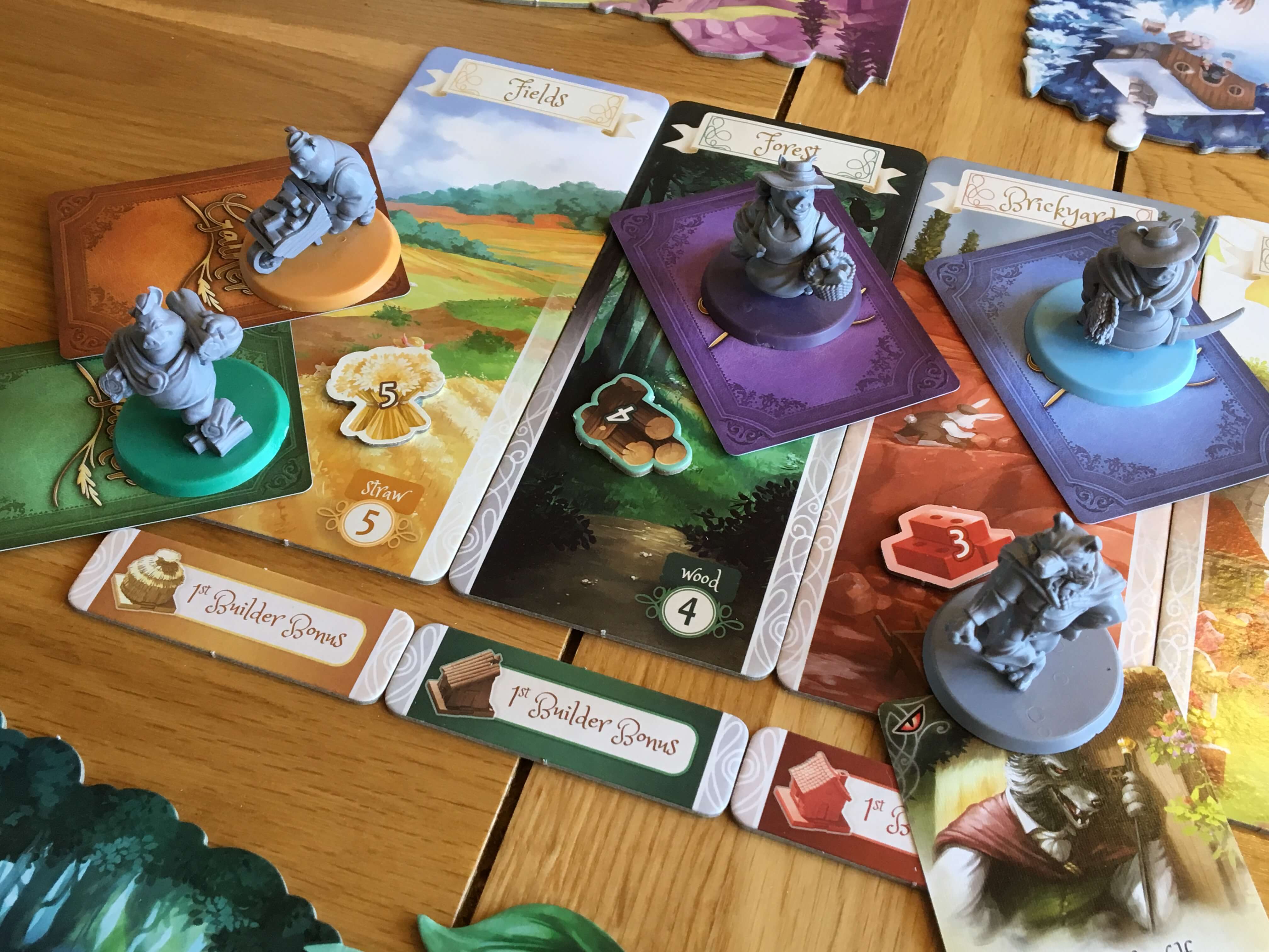 Among the fable cards, several (including a number of monsters) have negative effects on other players, introducing a number of confrontational mechanics. Most of these are fairly mild and involve messing with the chosen gather locations, changing the way resources are shared out or adding a bonus to certain spaces but not others. Resources can be converted into building sections in the second phase of each turn and the first player to build three houses wins. If more than one player completes three houses in the same turn, the sturdiest houses win the tie.