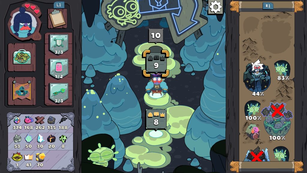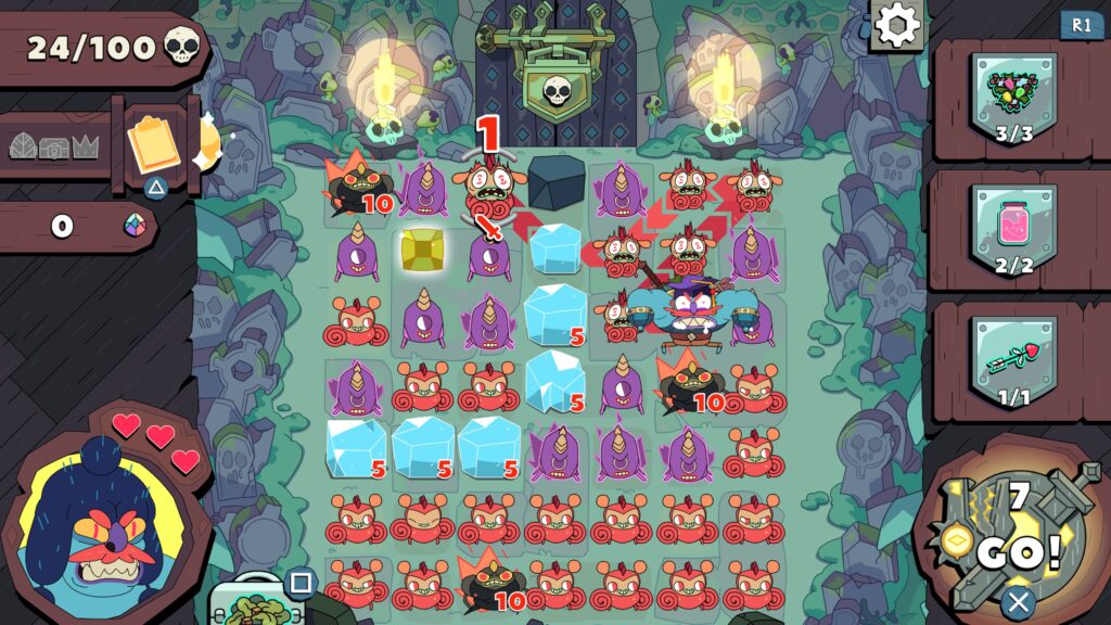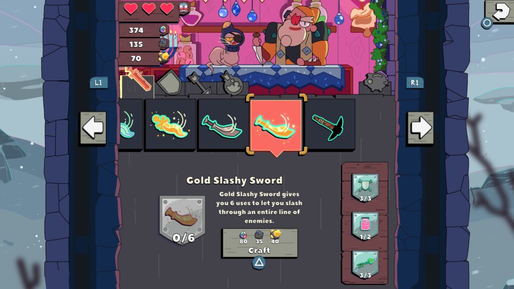 Control with a controller feels a little fiddly the first couple of levels, but you soon get used to tapping directions to simulate dragging your finger around to make a path. Gameplay gets a little more complex when craftable equipment (weapons and armour that have various buffs, or that you can activate with limited uses) come into play, and trying to complete the three goals on every level (escape, open the chest, capture a king) can sometimes require a lot of brainpower, and also a lot of luck (which I’ll touch on shortly).