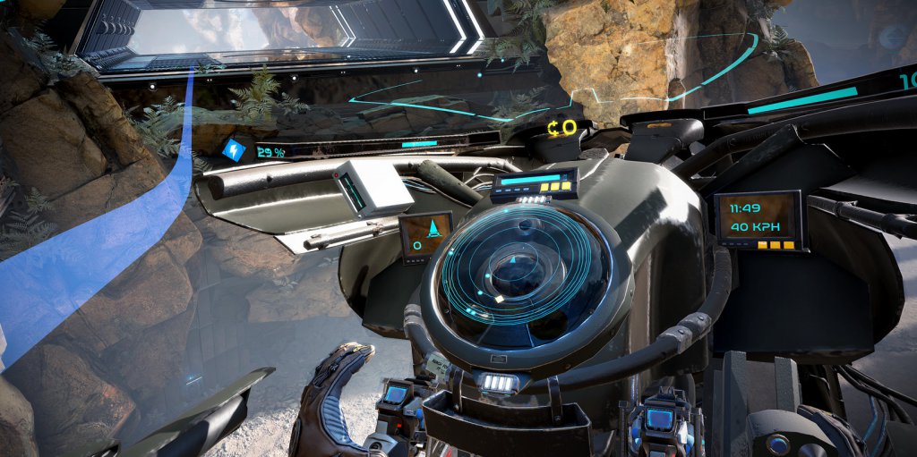 The holographic user interface map in Ground Runner: Trials that is attached to the center console of your bike should win some type of award for its simplicity of use. It makes navigating and finding the various floating drones around the level that are firing holes in your back even easier, with indicative red markers that stand out from the blue dots of the crystals that you are searching for. You can also see your current objectives at a glance, and having a map that’s part of the worldspace — without being in your face while you are trying to drive — is always a welcome addition to a VR game, in my opinion.