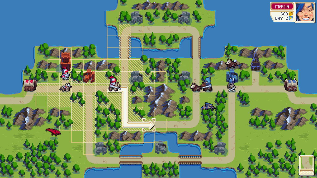 Unlike the mechanised warfare focused battlefields of Advance Wars, Wargroove’s battles take place in a fantasy setting – armies of goblins and skeletons accompany their appropriate hero unit. There’s nine* heroes in the game, each with their own power, and -in another shift from Nintendo’s series- an actual avatar in the game. What this means is that the characters have to be moved carefully, and used where they can have most impact on the battlefield, as their skills are only effective in proximity to them.