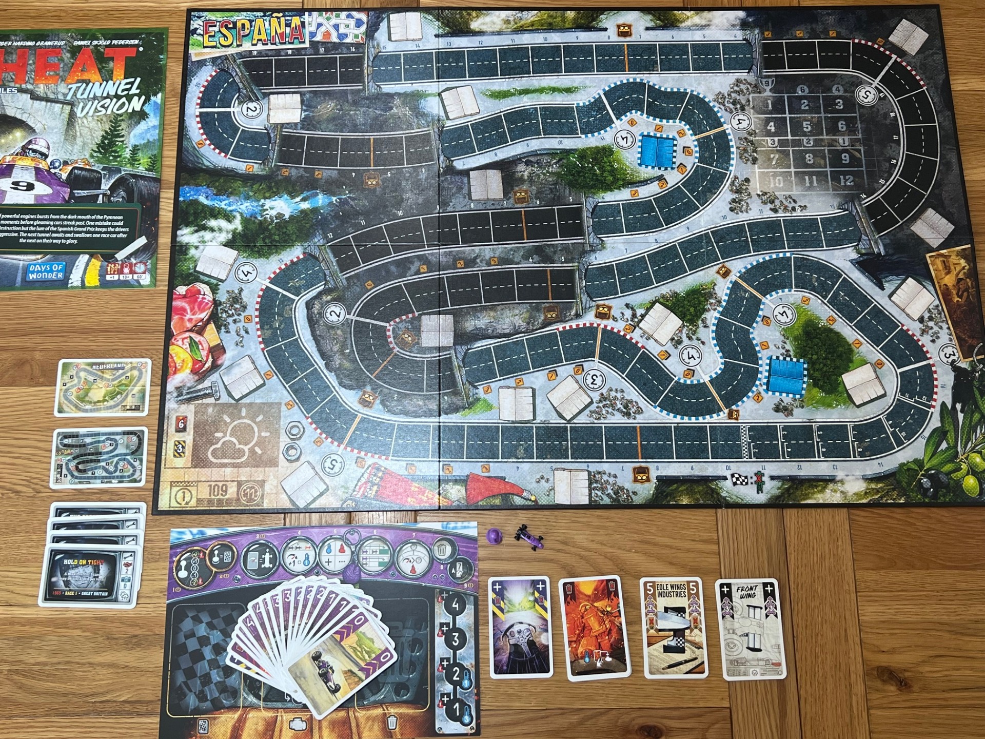The first, and perhaps most obvious addition in HEAT: Tunnel Vision is the new board. As always, this is double-sided and includes Espana and the Netherlands. Espana features a number of tunnels that prevent the player from discarding cards no matter what other effects might enable a player to do so. This simulates the intensity of racing through tight tunnels in real life races such as Monaco, but as a gameplay mechanic, it’s a very slight change.