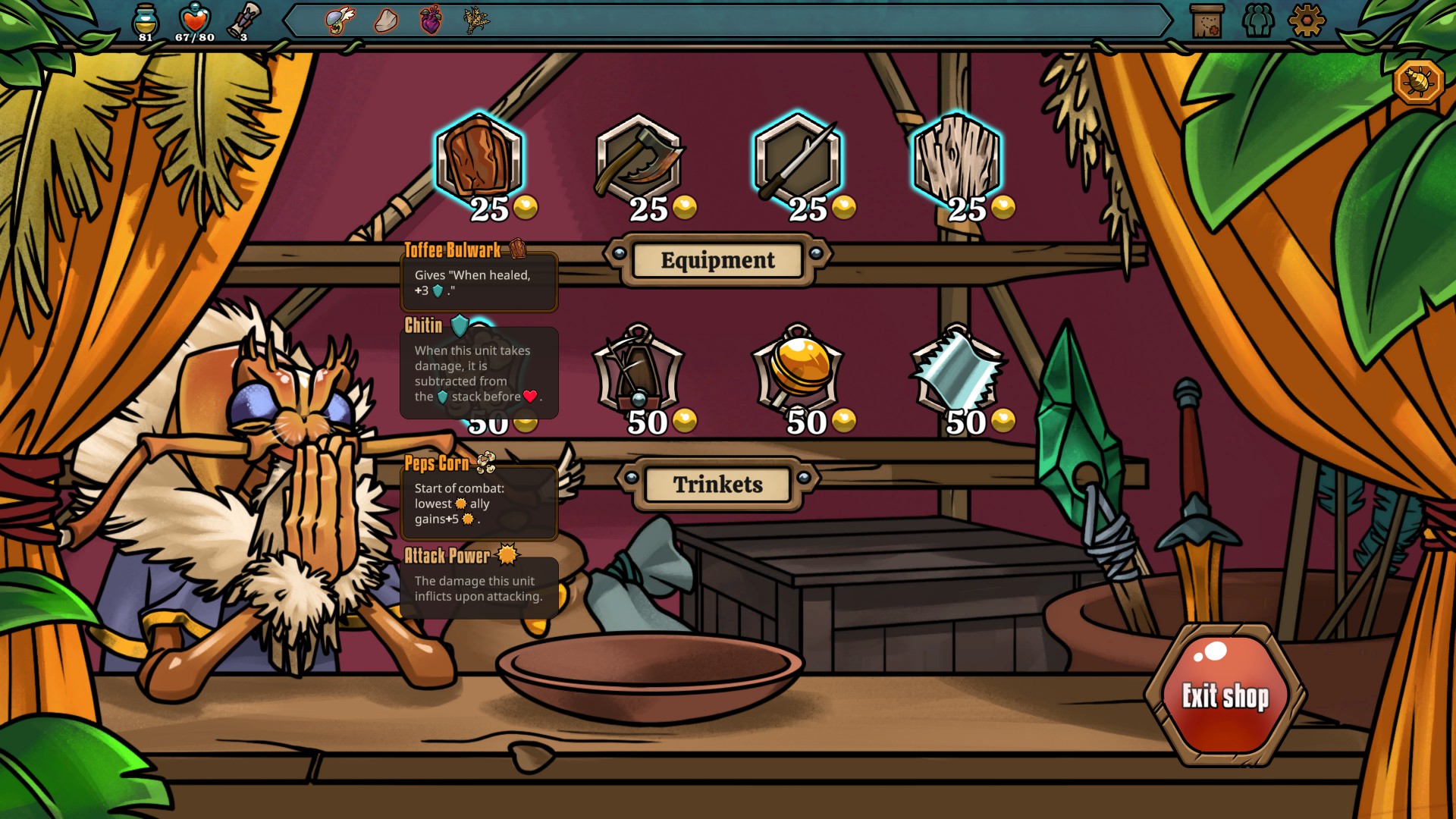 All of the denizens of your insectoid army are pooled from factions. You’ll choose a primary and secondary faction each run, with a free unit from each and a trinket from the primary. This can help get an engine built in the way you want, as faction choices also limit the pool of available trinkets and units in the run itself. It’s relatively reliable to try different strategies, which is a blessing for buildcrafting but can make runs blend together a little over time (Then again, we all fought Snecko 100s of times in Slay the Spire and still love the lil goober).