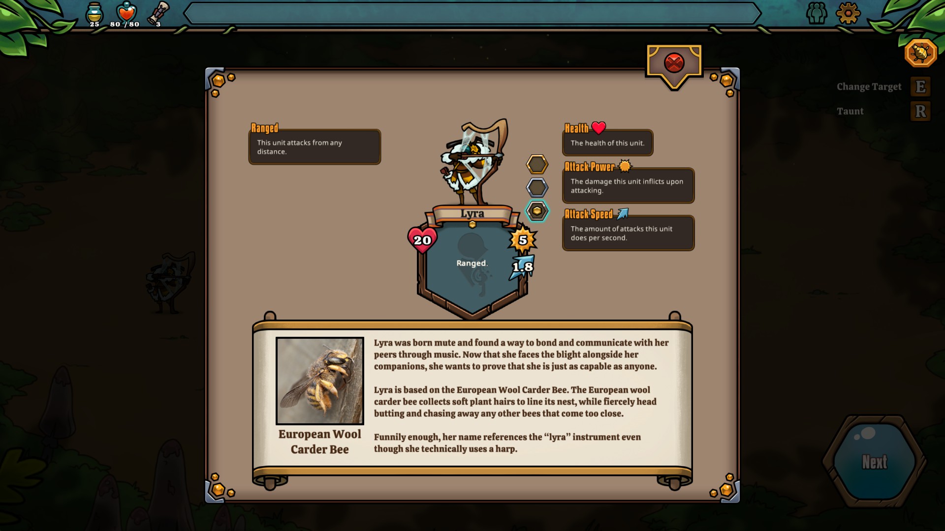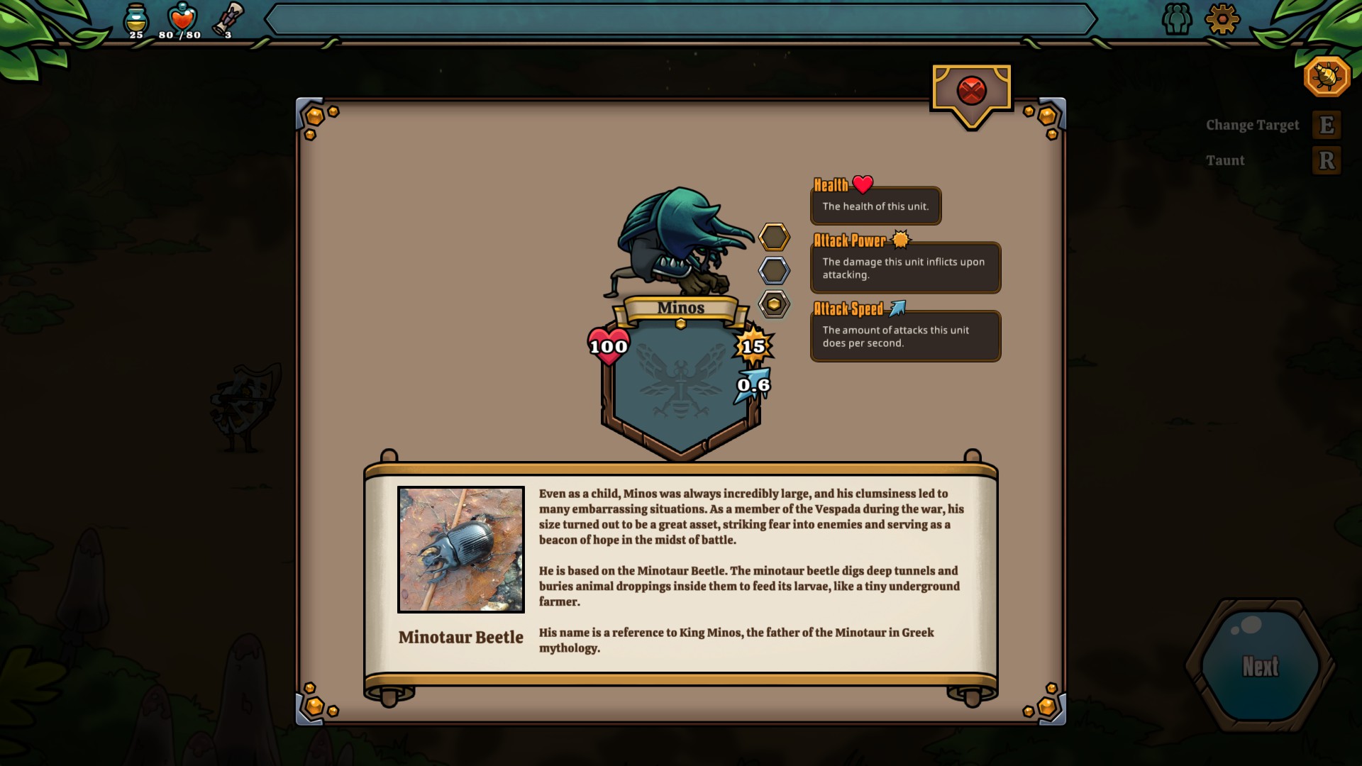 While the process of drafting new units and positioning them for each battle is a familiar gameplay loop, the presentation is anything but. Each of the creatures you enlist and face have a clickable icon that brings up their in-game art, a description box of the character and, most importantly, a real-world picture of the unit’s inspiration. Everything from Bollette mushrooms to Honeybees to Leaf bugs are represented, and having that connection to the real-world creatures that we can find all around us really pulled me in.