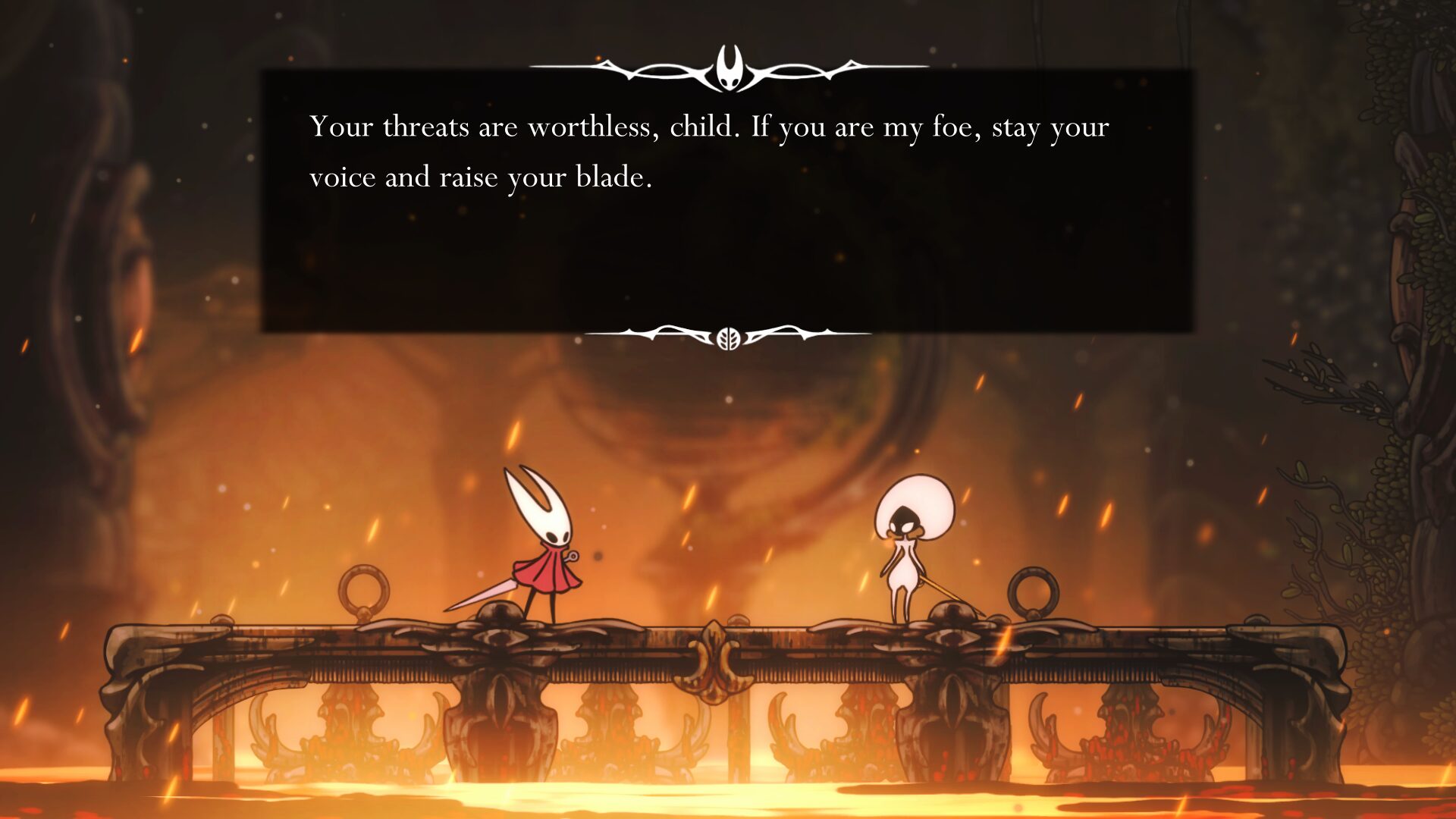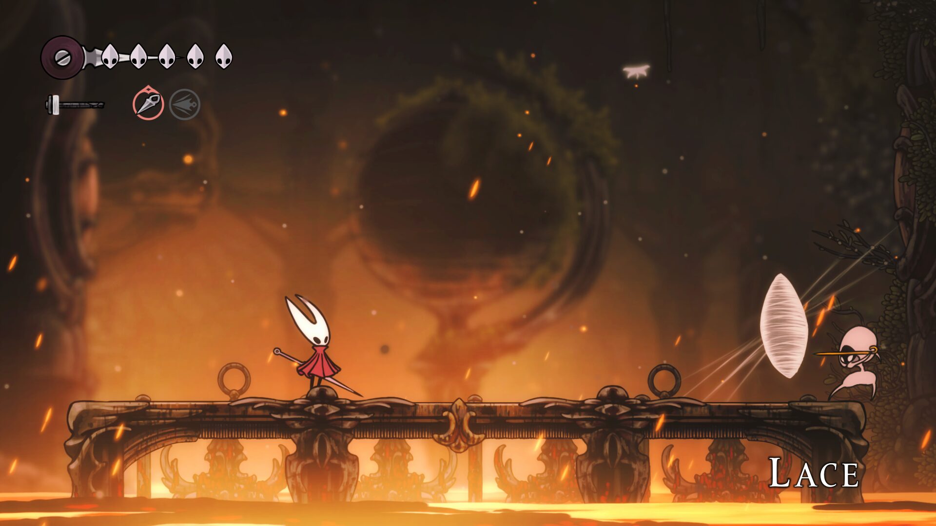 On the subject of bosses, unironically I found the bigger bosses a little boring in design. The fights themselves weren’t boring oh no — they were challenging and difficult, but not insurmountable. However, there are several bosses that are the same size, if not a little bigger than Hornet, and that’s when the game really comes into its own. The fights with Lace, a being composed of Silk, comes to mind. These fights were just as hard, but made it feel like a true dance, a real duel against a skilled equal, as compared to massive beasts. Again, no less fun, but it feels like the game was designed around these same size enemies.
