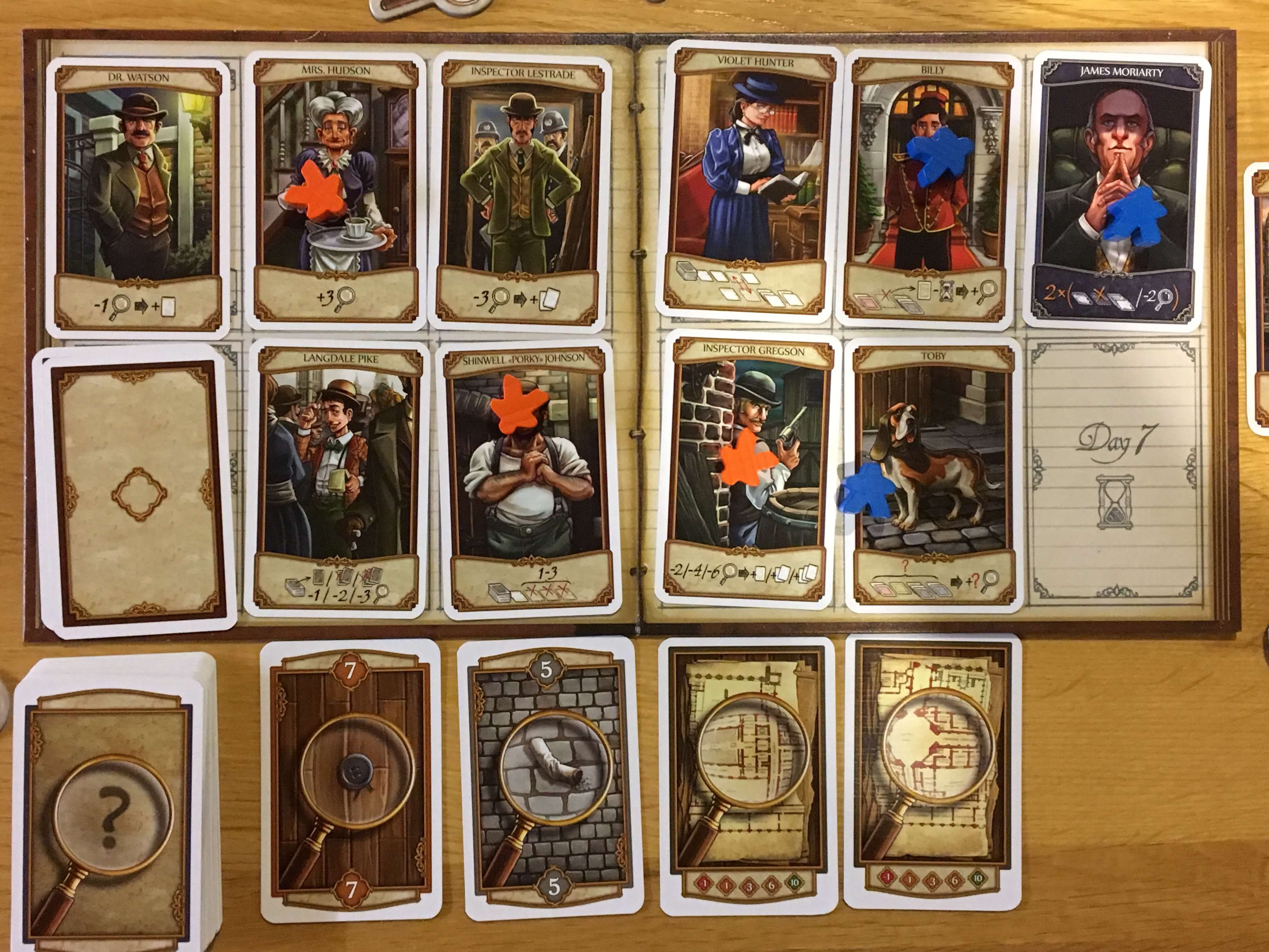 Every game begins with the three named characters who offer set benefits, as well as the two characters who are drawn for day one. The game unfolds with the players taking turns to place their meeples onto the board. As an example, when a meeple is placed onto Dr. Watson, the player can spend an investigation token to take a face up clue. Mrs. Hudson allows the player to draw three new investigation tokens. As you can probably imagine, the additional characters do less predictable (but occasionally more powerful) things.
