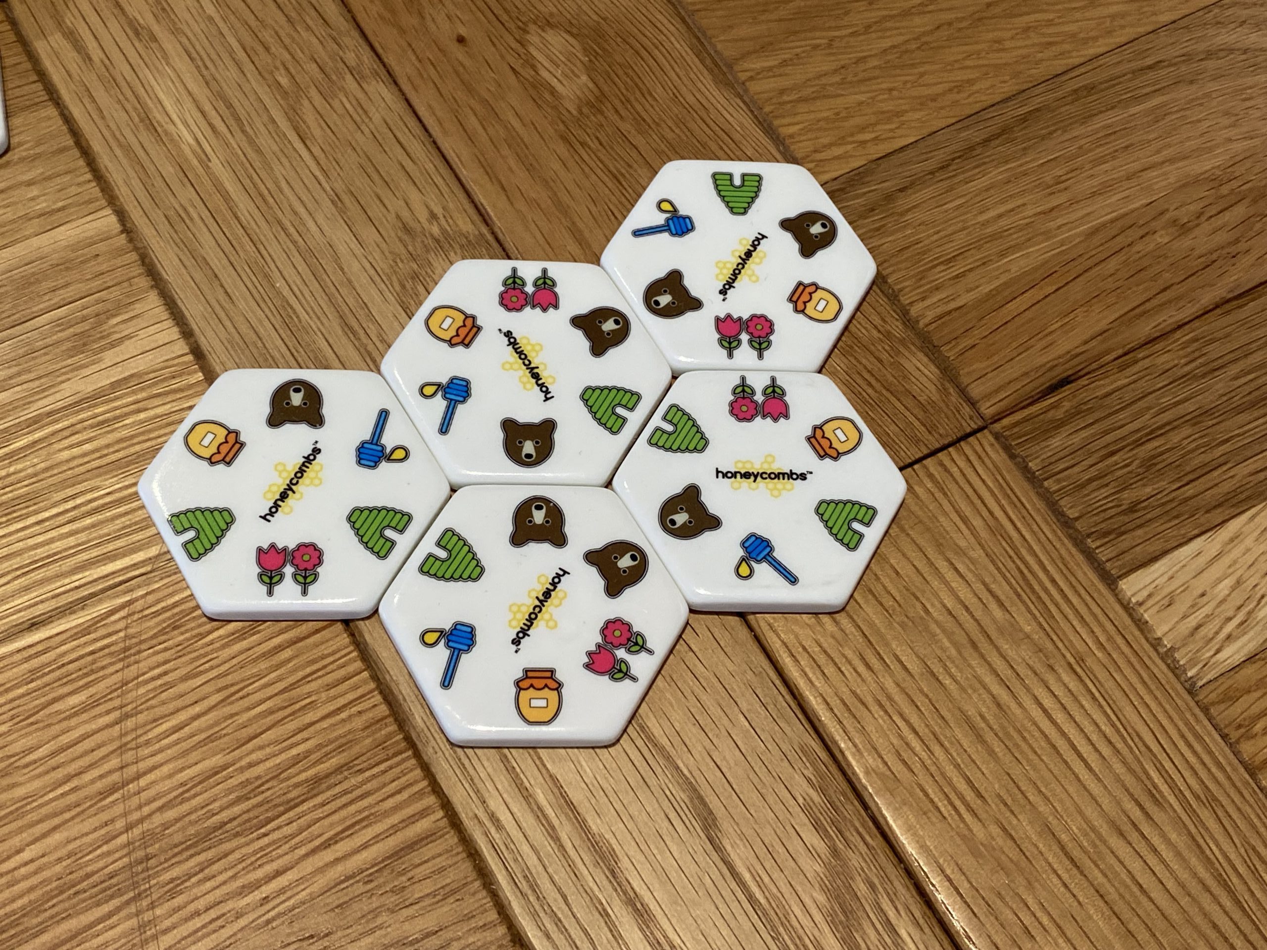 Honeycombs is super, super simple and I quite frequently play it with my eight, six and three year old children. Without doubt, the older two are fully capable of playing it in any mode, whilst even our youngest can grasp the concept — even if she often loses patience halfway through. The big chunky pieces are large enough for me to feel comfortable with her having them, as based on my experience they are too big to swallow and because they are so chunky, she is happy to build towers with them, or clack them on the table in between turns and hasn’t seemed interested in reimagining them as cookies.