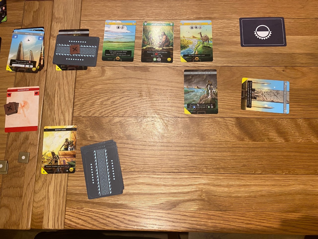 Each civilisation also has its own ways of scoring points as well — which the rule book will generally outline — but some are simpler than others. For the Minoans, for example, the Pottery card (which has the barbarian symbol) can generate a ton of victory point tokens, but they must stay on it until you decide to sacrifice pottery and recycle it into your deck.