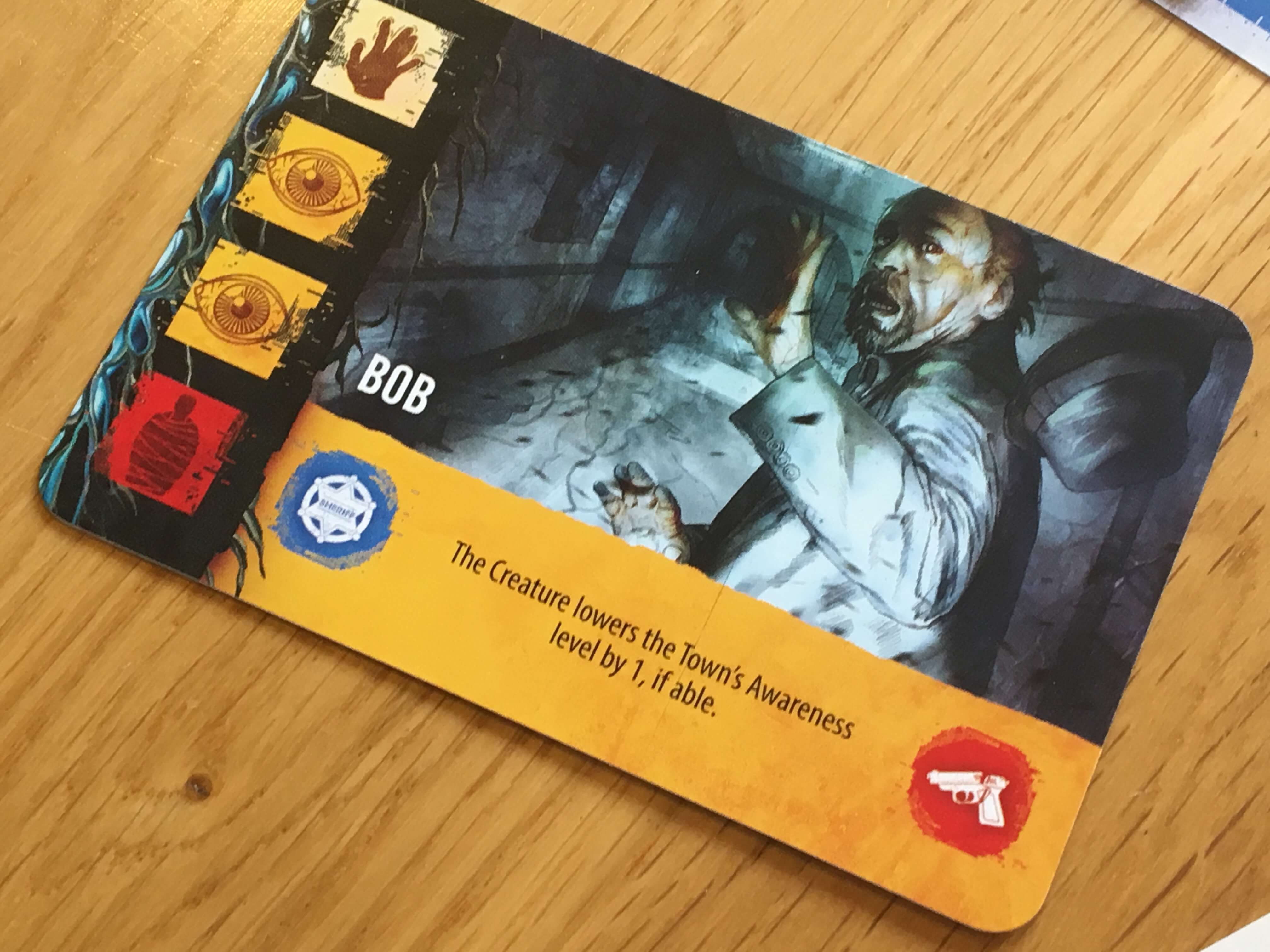 Inside the box, the character cards accurately depict the same kind of small town sheriffs, nurses, store owners and innocent bystanders that brought such a human angle to Stranger Things. The human side of each card generally shows those people behaving normally in their jobs or home lives, whilst the creature side has them clutching their faces and rocking in despair, or running from an unseen menace.