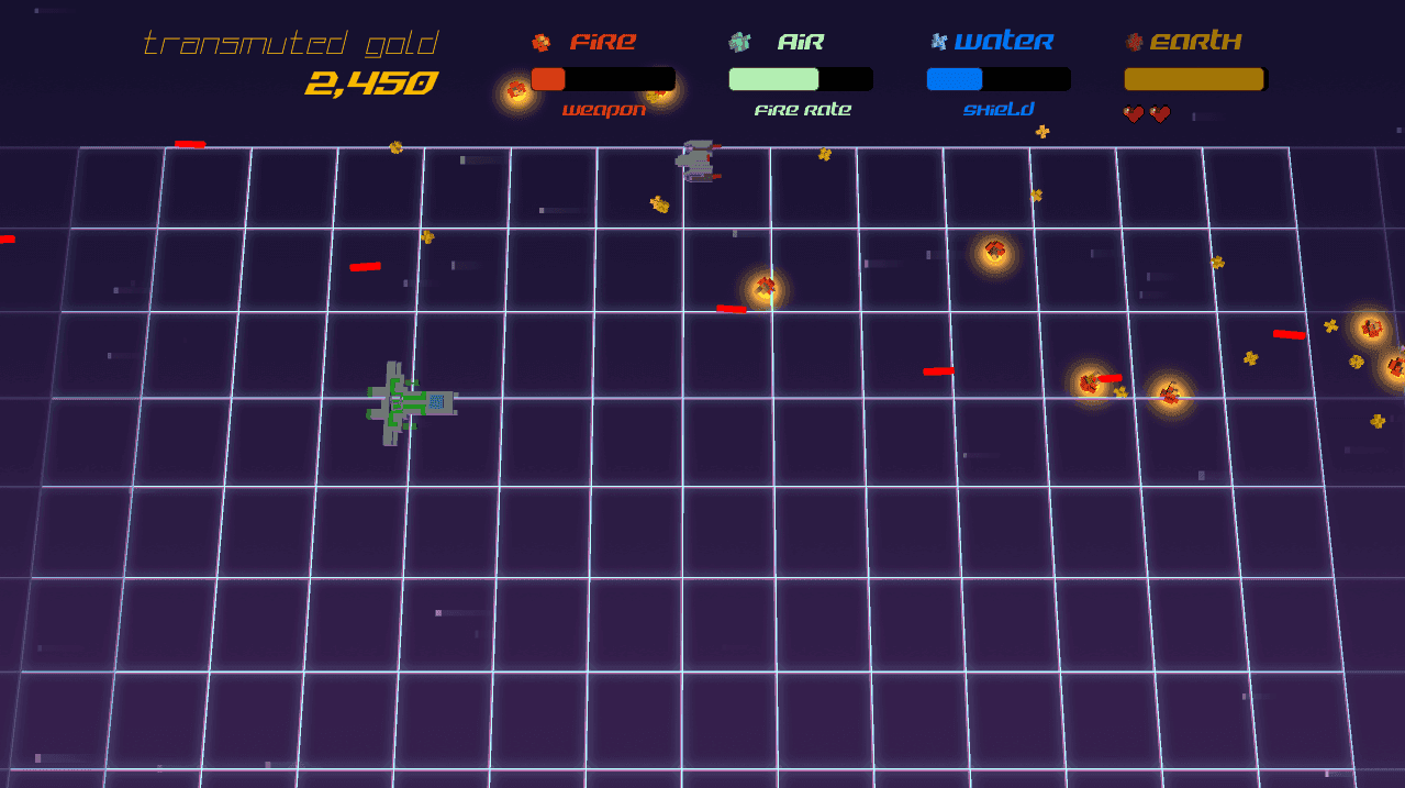 Philospher’s Strike is a space shooter where you must gain resources to upgrade different parts of your ship! As you fly through outer space, you can shoot down enemies and asteroids coming towards you. They then burst into various resources depending on what they are made of. These resources — Fire, Air, Water and Earth — are then divided into different categories to upgrade various parts of your ship. Fire upgrades your weapons, Air upgrades your fire rate, Water gives you a shield and Earth gives you more life. As you fly around, you need to maintain a balance between collecting all of these different elements and staying alive as you do it. Gold sometimes falls from enemy ships (especially as these enemies grow more challenging) which can be collected for points. Philosopher’s Strike is a shooter taken up a notch — it’s just fun!