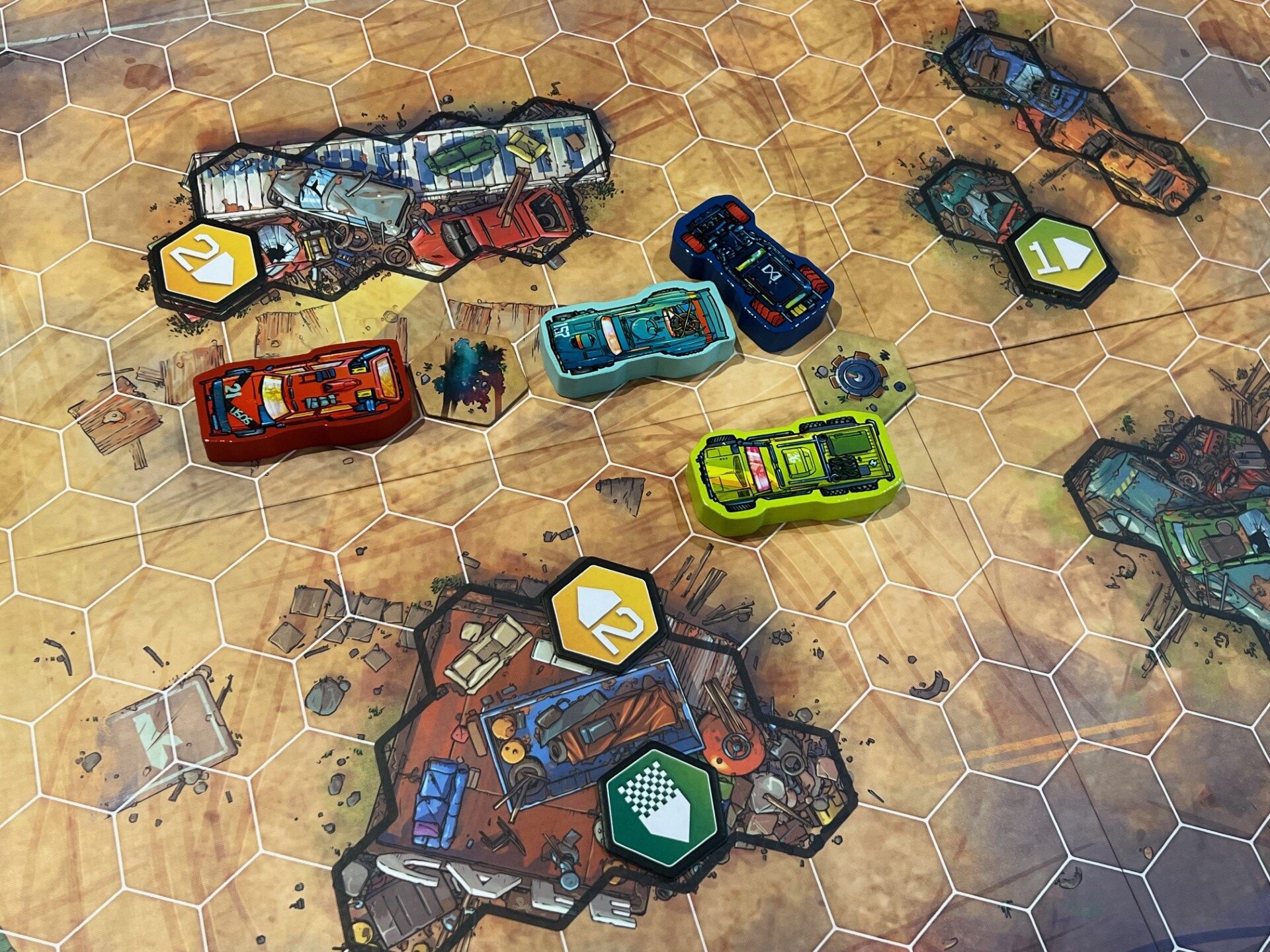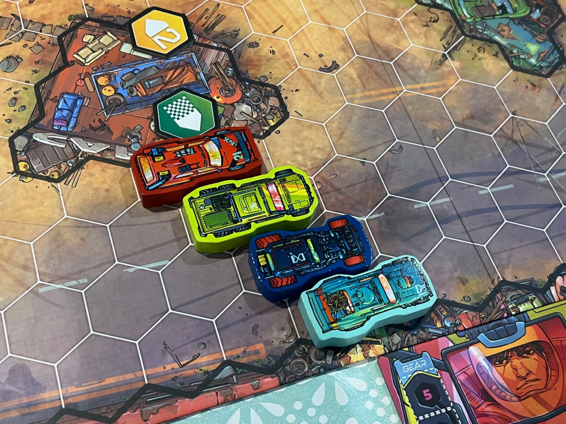 Set up is fairly quick, and the rules are relatively simple. Each player chooses a car (there are four in the base game box, two extras in Next Gen and then two more in retail expansions, or four more in the Turbo edition. Each character comes with their own chunky wooden car, a player dashboard and a set of dice to match. They also get a little plastic gear stick and three unique power tokens that might be spent over the course of the game.