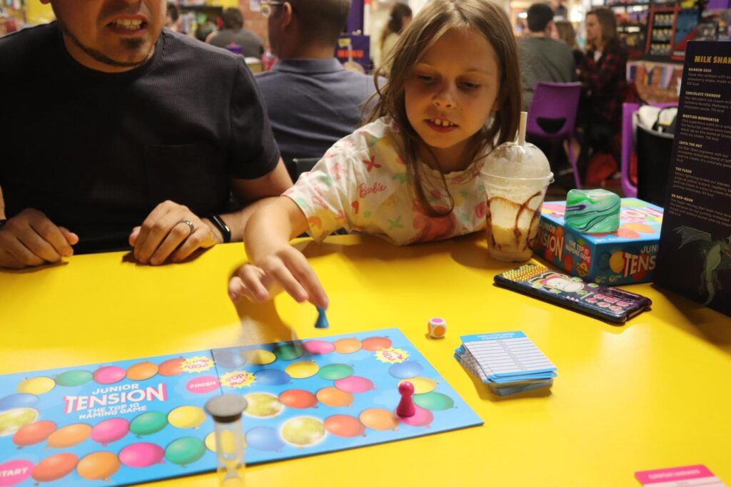 In addition to the tracker, category decks and the hourglass, Junior Tension also comes with a board, die and counters, as there’s a simple points tracker to slide your way around for the win. There are Snakes & Ladders style icons on there which tricker a dice roll (moving you back, or forward, to the colour you roll) which adds a little bit of an equaliser when it works in your favour, however, the tracker itself is pretty straightforward — albeit, certainly better than nothing.