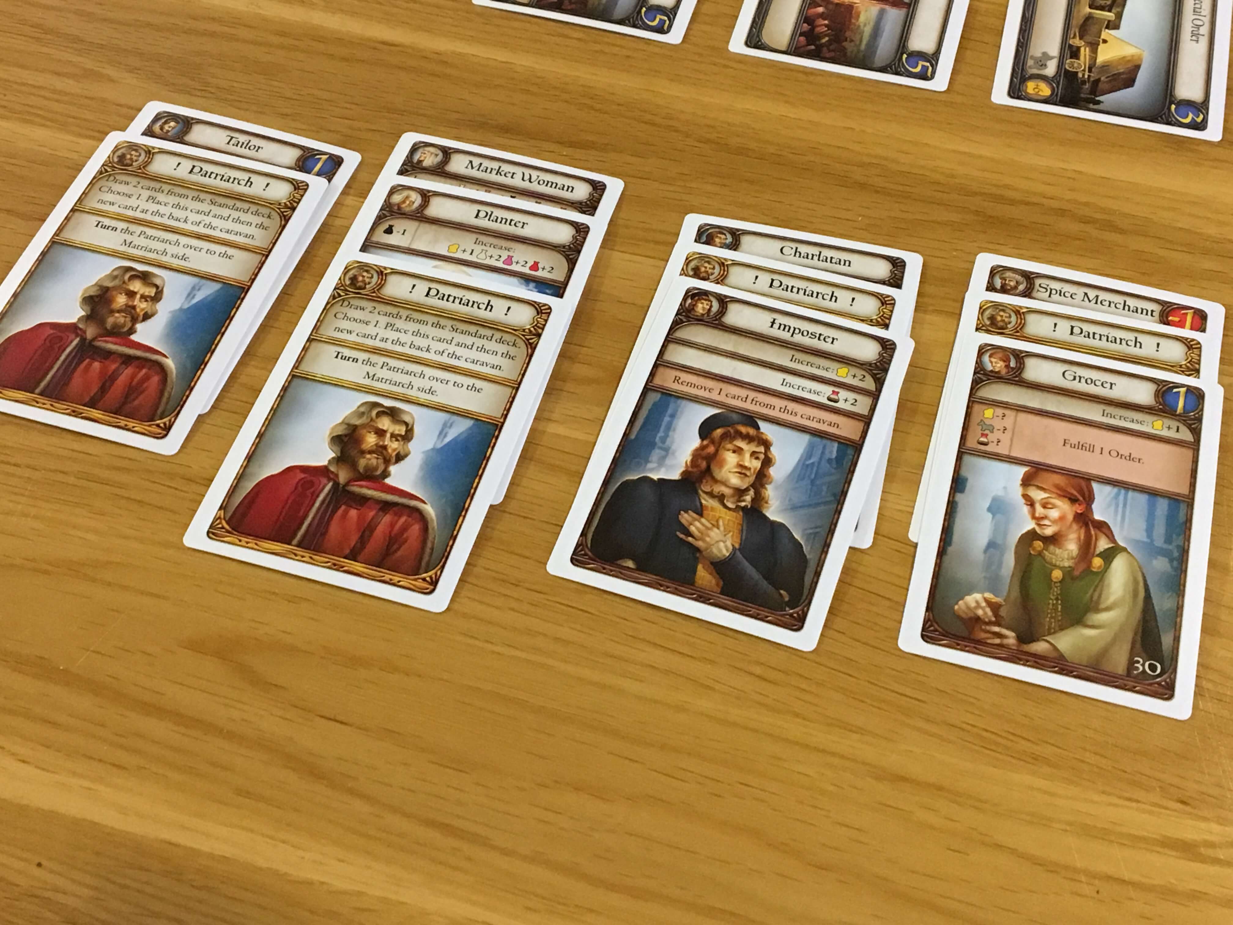 With a few specific exceptions, Caravan Actions will always result in having to move the card being used to the back of its own caravan, whilst conferring some kind of benefit. All players begin with a double-sided Patriarch card, which can be flipped to its Matriarch side as a Caravan Action. In addition, its primary action is to draw two standard cards, choose one and add it to the caravan. This will almost always be the opening play for all players, but as the caravans grow larger, the followers that The Patriarch cards recruit begin to gain prominence. You may add farmers, market traders, thieves, beggars, nobles, guards and much more to your caravan over the course of the game.