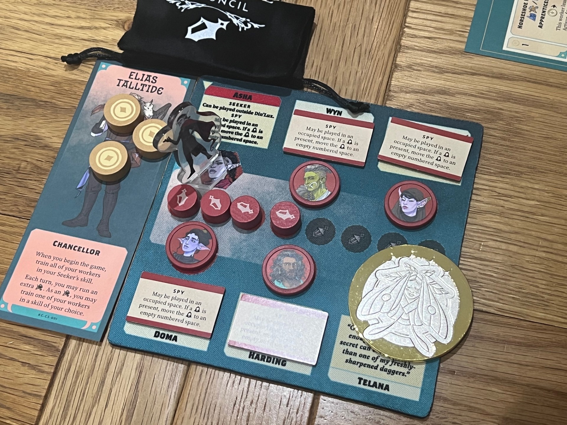Delightfully, I was sent the deluxe component upgrade box, and it’s hard to imagine going back to cardboard tokens now. The velvet bags for each player are a tactile delight, the upgraded influence tokens have a satisfying weight, and the neoprene guild mats are both functional and visually appealing. That said, the council member mats are still thin cardboard, and when placed next to the neoprene, the mismatch is jarring. It’s a small issue, but one that stands out in an otherwise premium production.