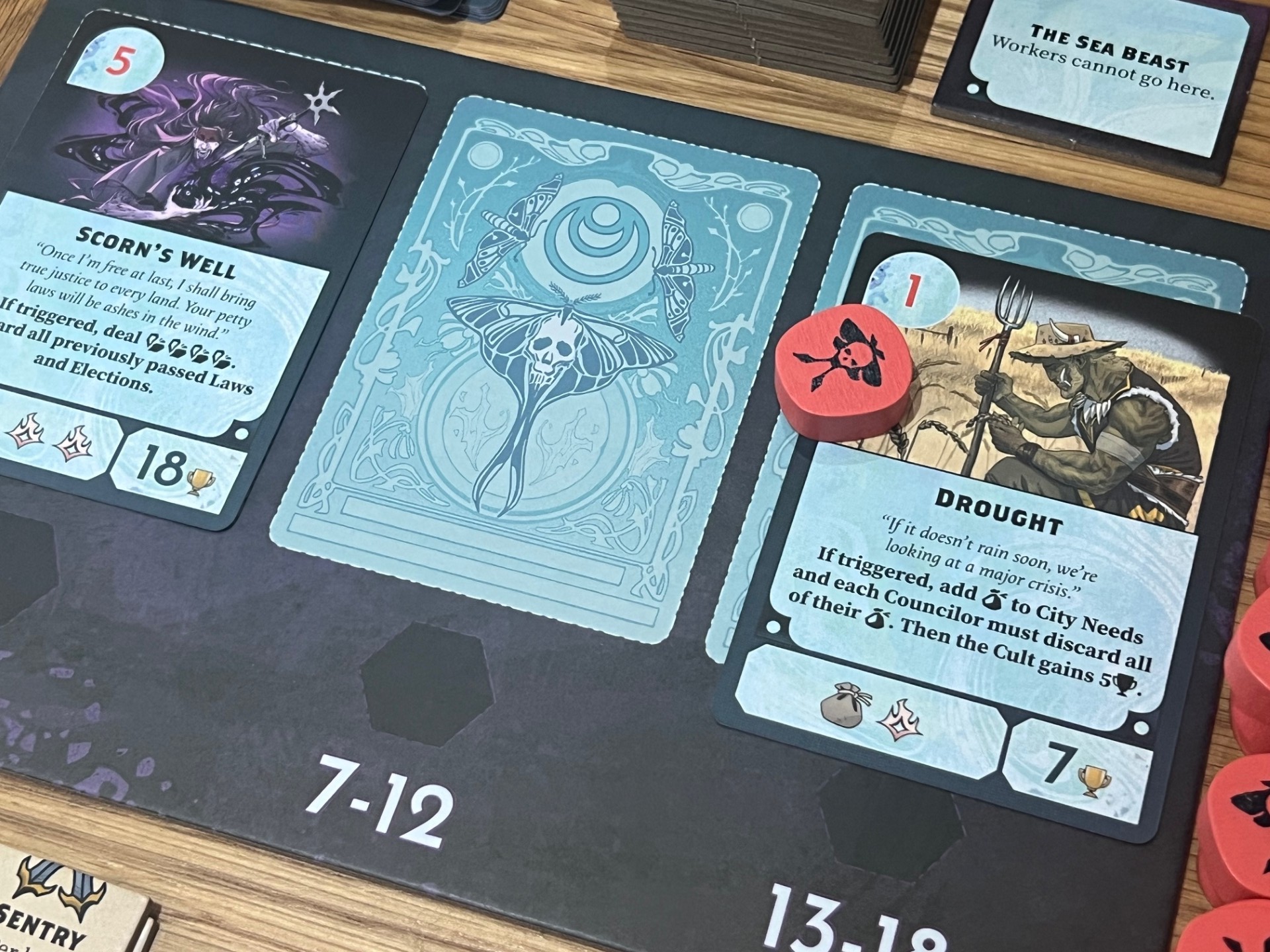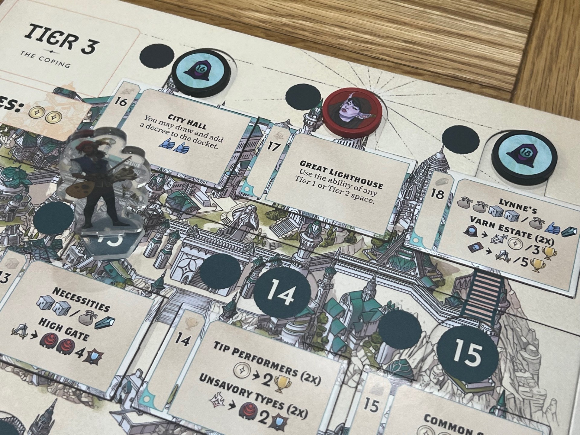 All of this said, there are still a few things to mention. I’ve spoken about lighthouses a couple of times but not in detail – and this mechanic offers the players something to invest in – gaining bonuses for doing so, or suffering consequences (from the cult) if not. Similarly, the city has needs, with things like food (goods) being in short supply. On the flip side (literally) players can pay money to flip worker placement slots and upgrade them, spending a valuable influence token to become the patron of that location — but helping to generate resources. These things (both good and bad) along with the voting and other features really make Kinfire Council feel like a world where you are influencing the city of Din’Lux.
